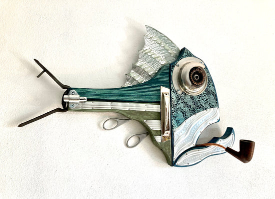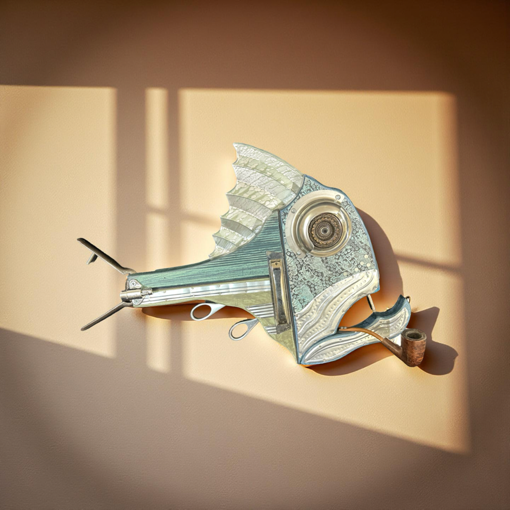 A whimsical and imaginative assemblage sculpture featuring a fish-like form crafted from repurposed materials. With a mechanical eye, metallic textures, and a smoking pipe, the piece exudes personality and charm, blending steampunk aesthetics with surrealist humor.