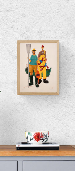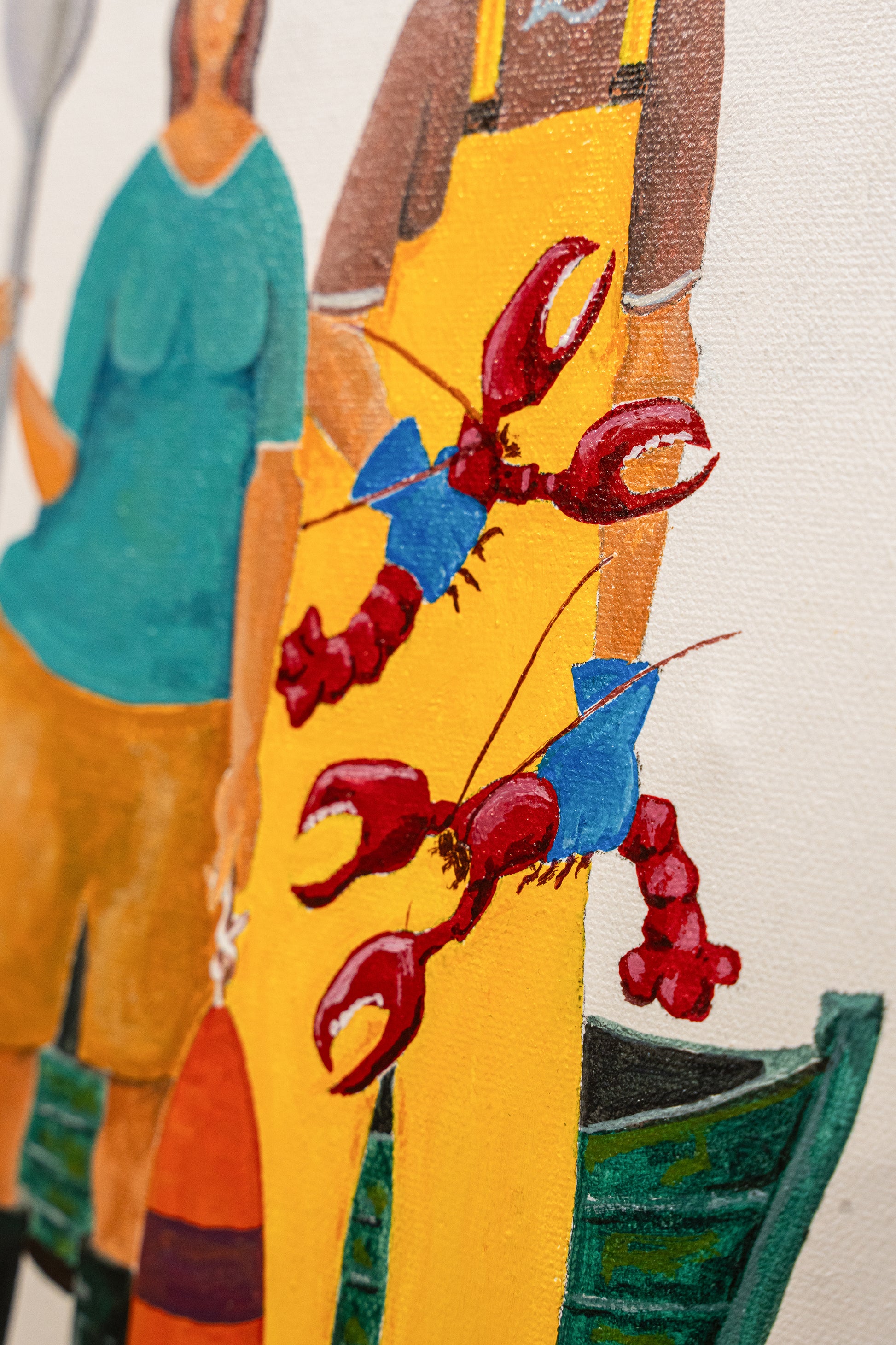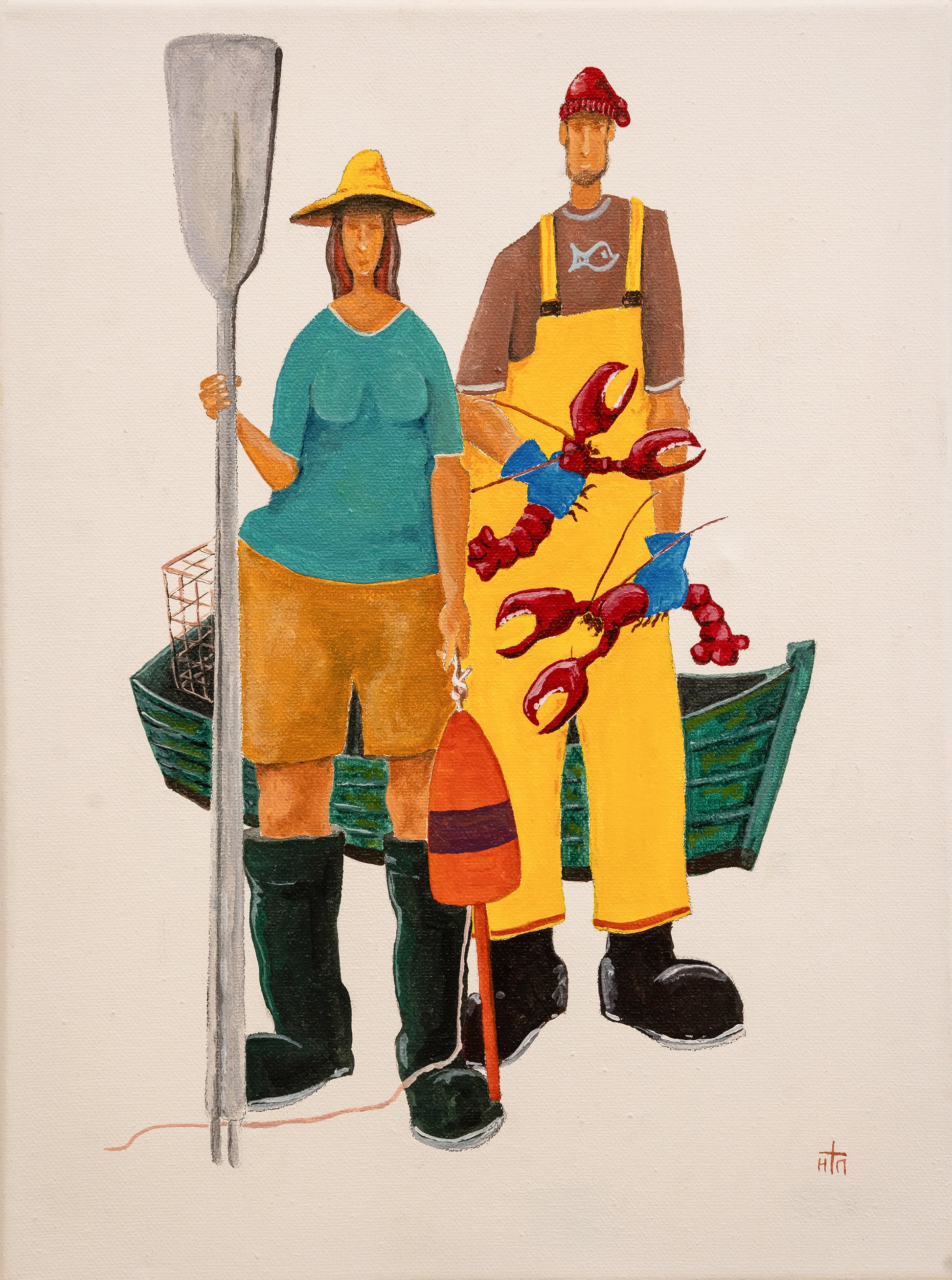 "Lobster Harvest" portrays two fishermen, one male and one female, freshly back from the sea with their catch of vibrant red lobsters. The painting uses bold colors and a straightforward composition to focus on the pride and toil of their work. This piece celebrates the hardworking spirit of coastal communities.