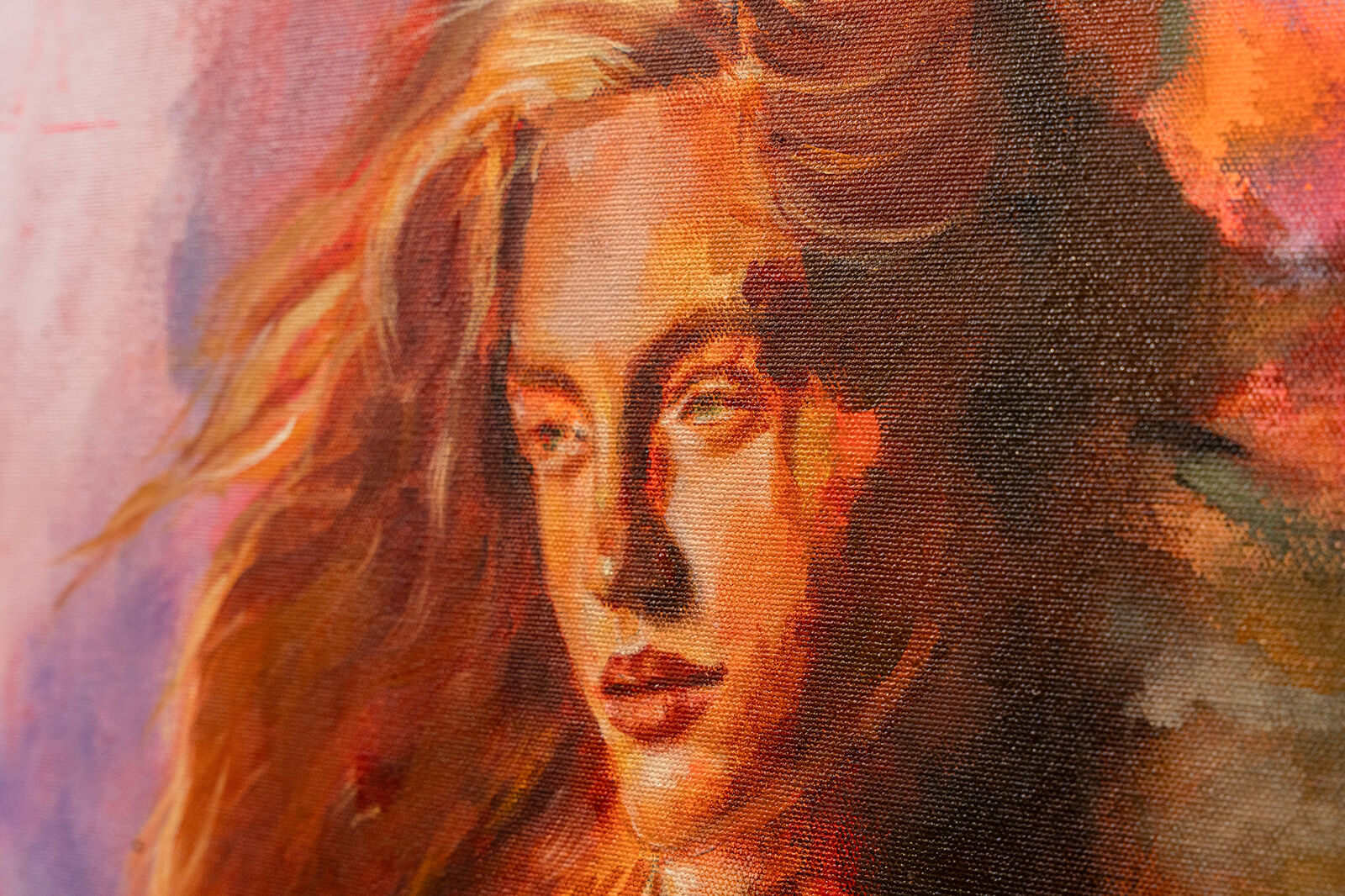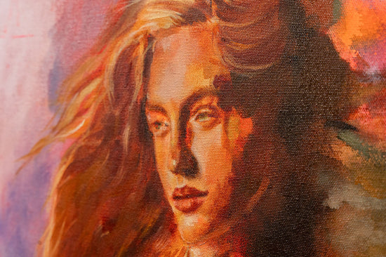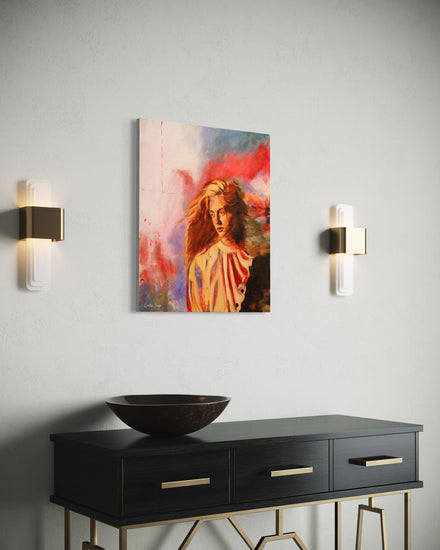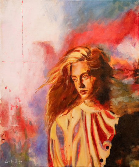 This painting captures a dreamlike portrait of a woman seemingly lost in contemplation. The warm palette of reds and oranges evokes the feeling of a sunset, while the soft, swirling brushstrokes give the impression of a gentle breeze playing through her flowing hair. The woman's downward gaze and the abstract background suggest a moment of introspection or reverie.