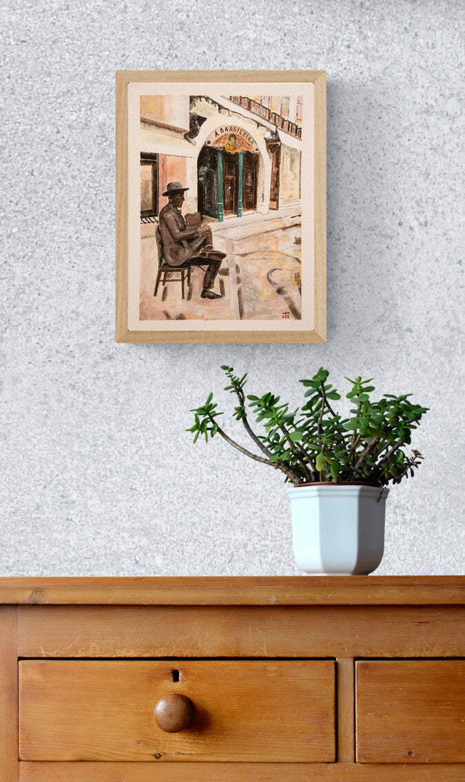 "Quiet Moment at A Brasileira" captures a serene scene outside the famous Lisbon café, A Brasileira. A lone figure, cloaked in a stylish suit and hat, sits immersed in his reading, oblivious to the bustling surroundings. The painting’s realistic style is marked by detailed brushwork and a soft, earthy palette, which highlights the historic charm of the location. This artwork invites viewers to ponder the stories held within the quiet moments of city life.