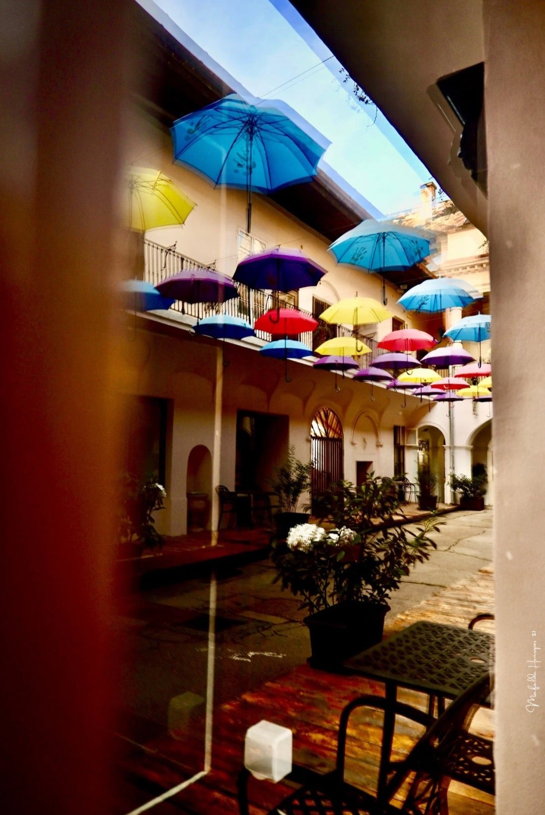 In this vibrant image captured on the streets of Košice, the eye is immediately drawn to the interplay of colors and shapes intertwined in a shop window display. The diverse and colorful umbrellas, hung on an improvised line, are reflected on the glass surface, creating a visual symphony that celebrates the essence of the city and its nuances.