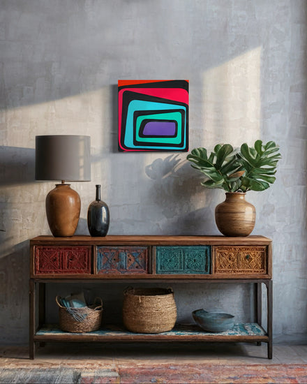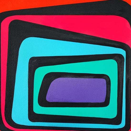 An abstract geometric painting featuring a series of layered, irregular rectangles that decrease in size toward the center. The bold color palette of red, cyan, turquoise, and purple, contrasted with black outlines, creates a dynamic and visually striking composition.