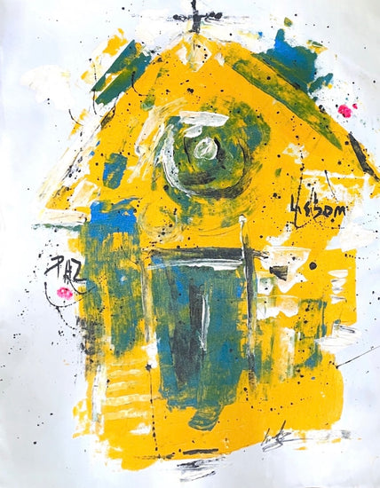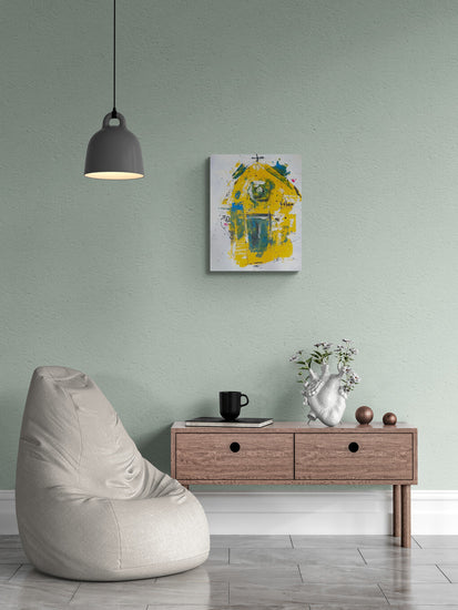 This piece combines bold yellow forms with softer shades of blue and green, creating a textured and layered composition. The abstract shapes and dynamic brushstrokes suggest a dream-like reverie, evoking a sense of contemplation and introspection.