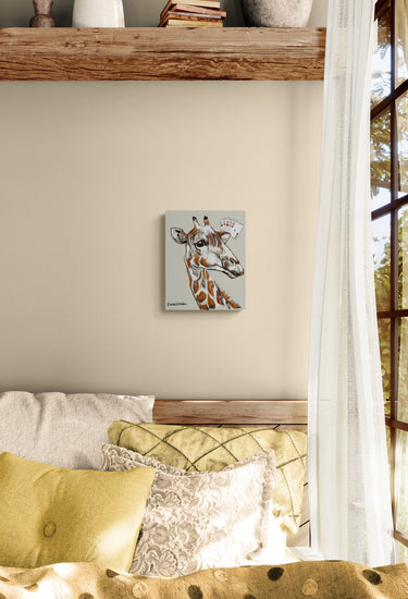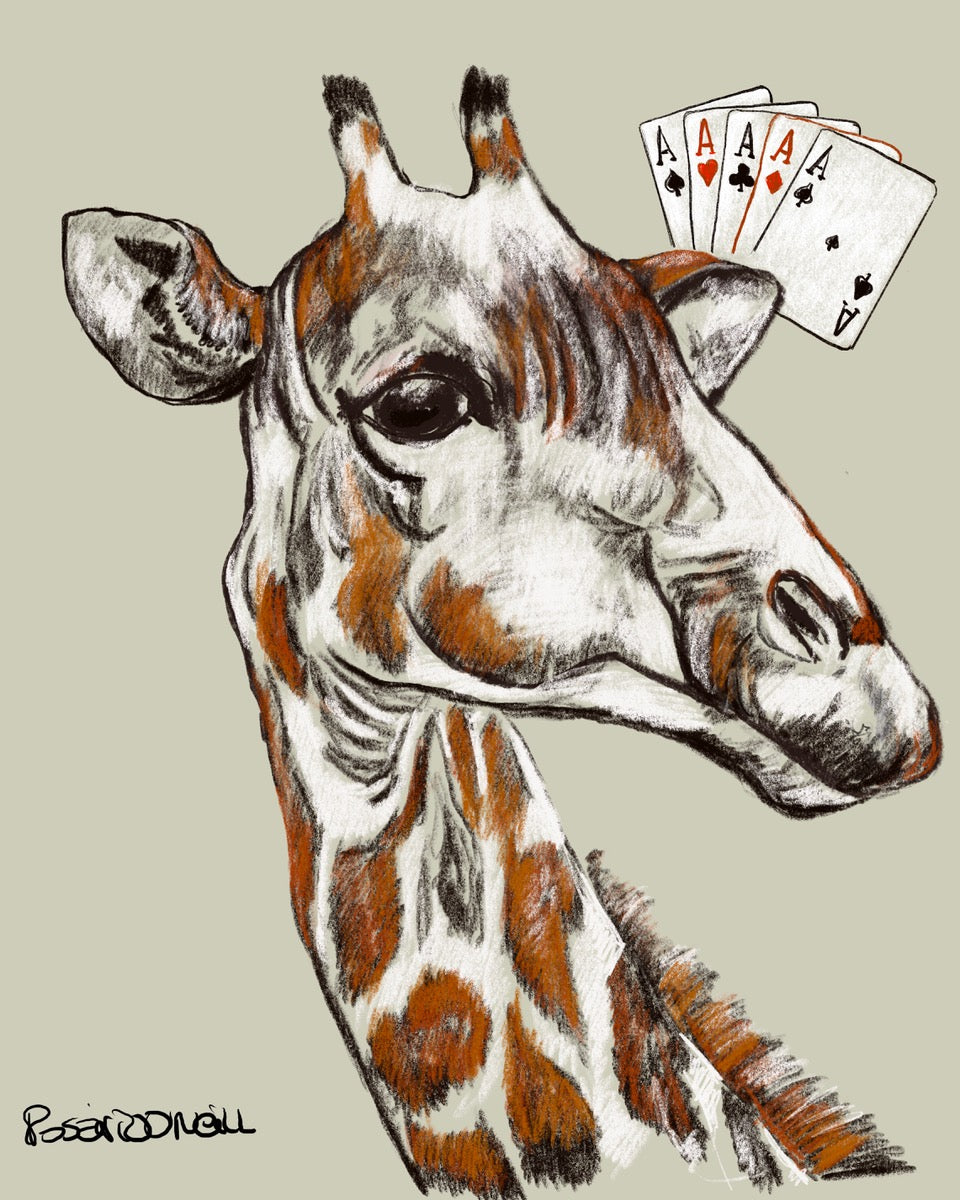 A detailed and expressive giraffe is the centerpiece of this quirky composition, with a hand of four aces hovering behind it, adding a playful element of surprise. The giraffe’s calm demeanor contrasts humorously with the unexpected addition of playing cards, making a statement on luck, chance, and personality. The soft neutral background brings attention to the vivid details of the giraffe’s fur and the boldness of the aces.