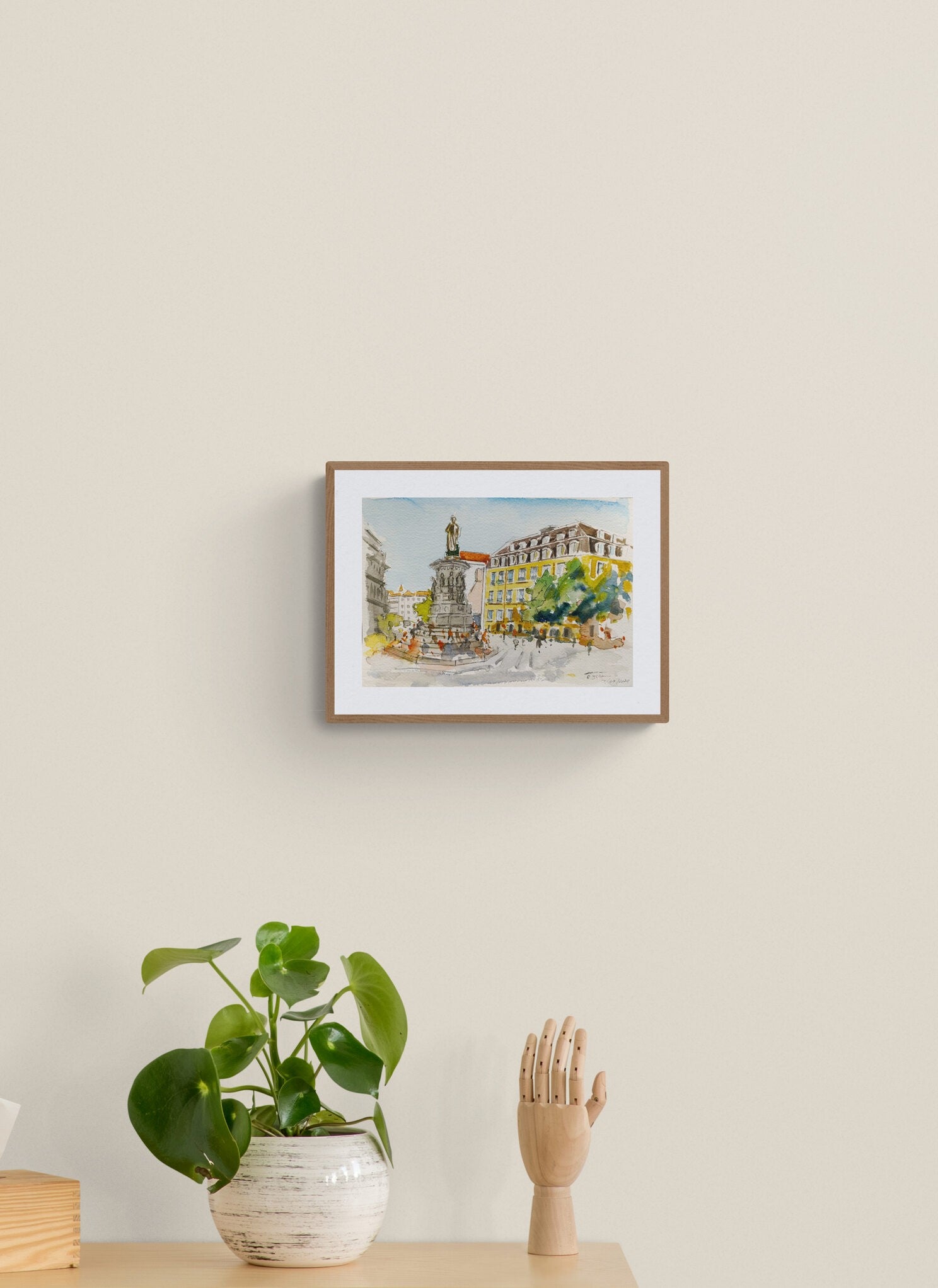 This watercolor illustrating a bustling city square, complete with the striking monument of a historical figure standing majestically at its center. The artist skillfully employs a loose, expressive style to bring the scene to life, allowing the vivid colors and fluid strokes to evoke a sense of movement and the liveliness of an urban afternoon. This painting captures the architectural beauty and dynamic atmosphere of the cityscape, making it a captivating addition to any collection.