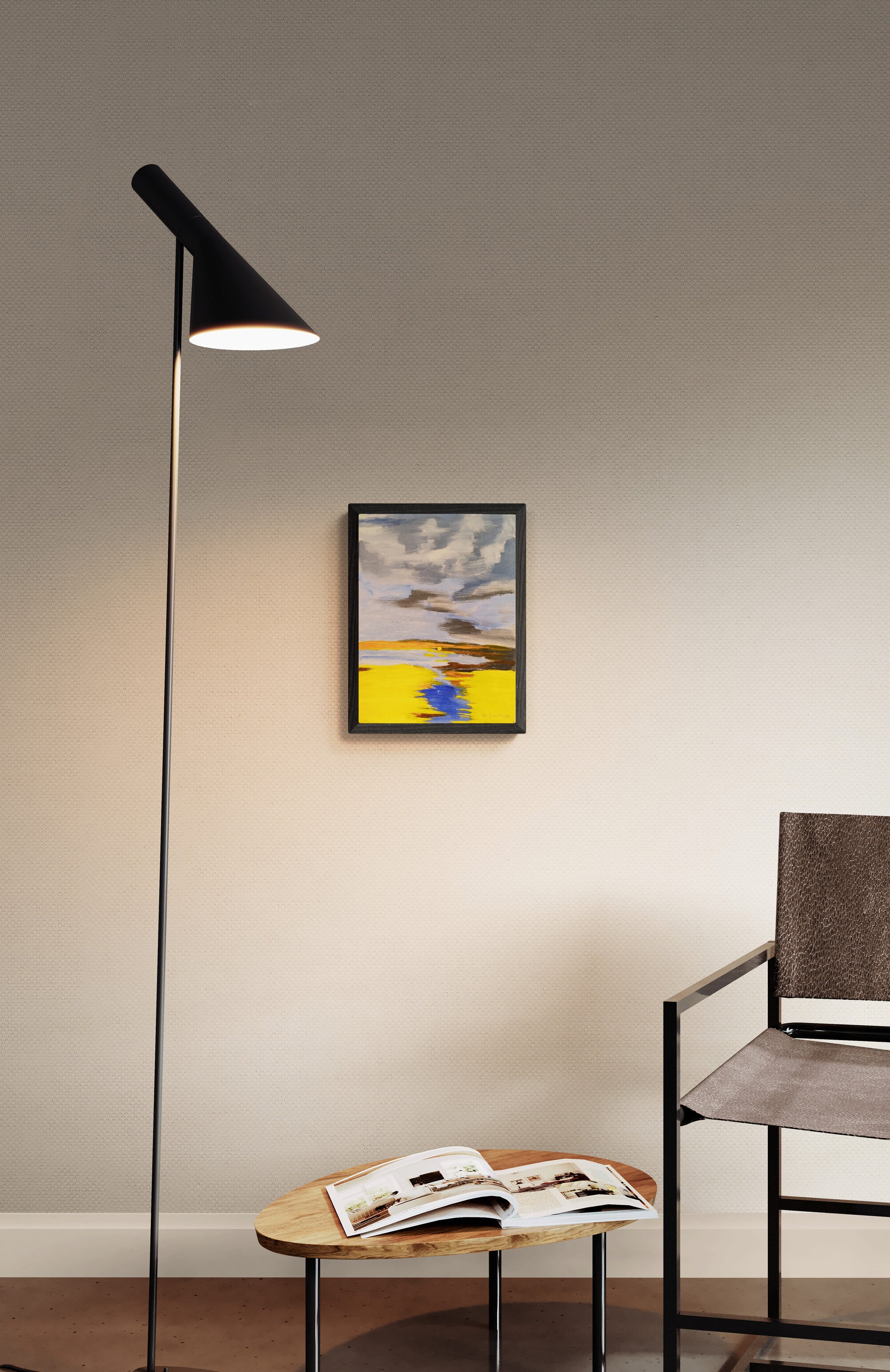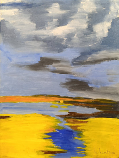 An expansive yellow field stretching towards a horizon, where it meets a distant body of water. A storm is brewing above, with thick, dark clouds contrasting against patches of lighter sky. The composition beautifully juxtaposes the bright warmth of the land with the cool, moody tones of the stormy sky. The reflection of the sky’s hues in the water adds a sense of harmony, while the lone sun, peeking out just above the horizon, provides a hopeful focal point amidst the impending storm. The artist’s expressive brushstrokes capture both the stillness of the landscape and the dynamic energy of the sky.