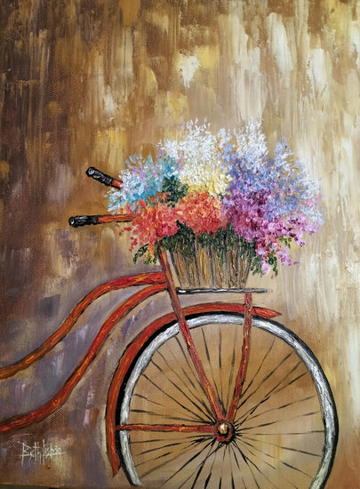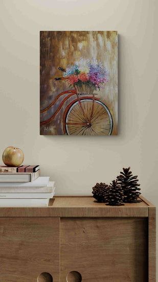 This charming painting portrays a vintage bicycle leaning against a textured golden backdrop, its basket brimming with an explosion of colorful flowers. The artist uses thick brushstrokes to create a vibrant, textured effect, emphasizing the freshness and variety of the blooms. This technique, known as impasto, involves laying paint thickly on the canvas, which makes the colors stand out and gives the painting a three-dimensional feel. The warm golden tones of the background contrast beautifully with the vivid colors of the flowers, creating a serene yet joyful scene.