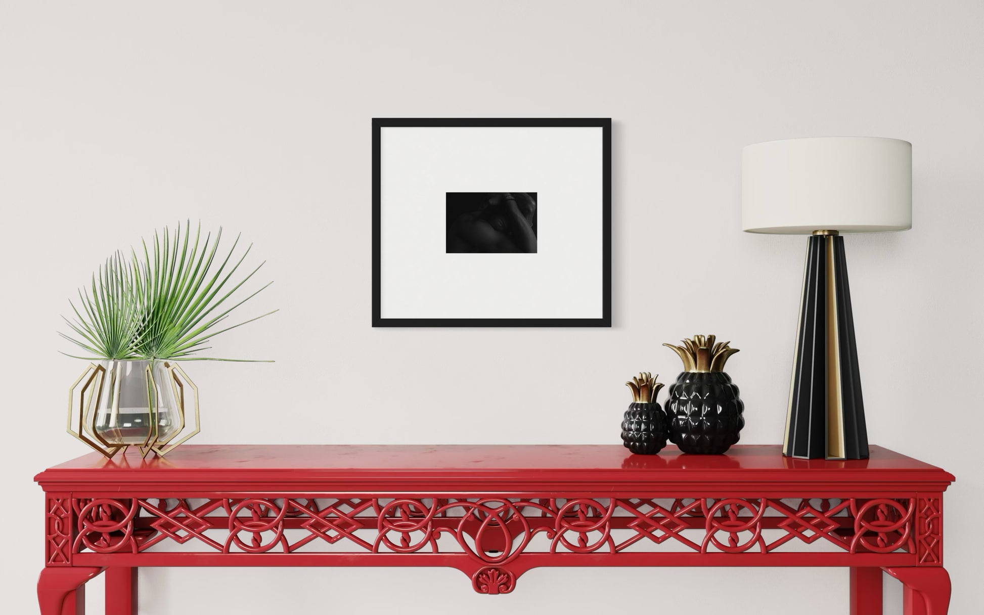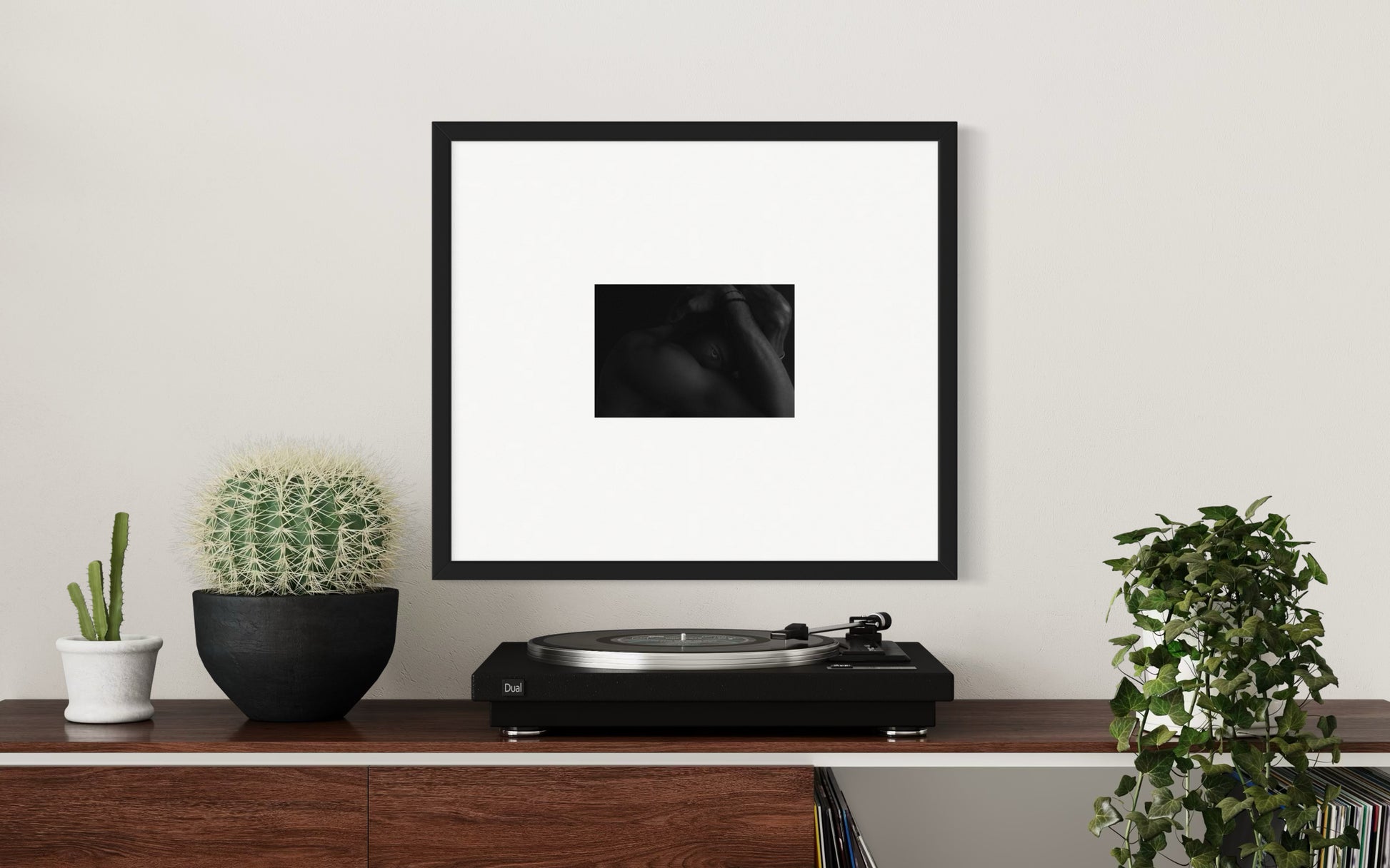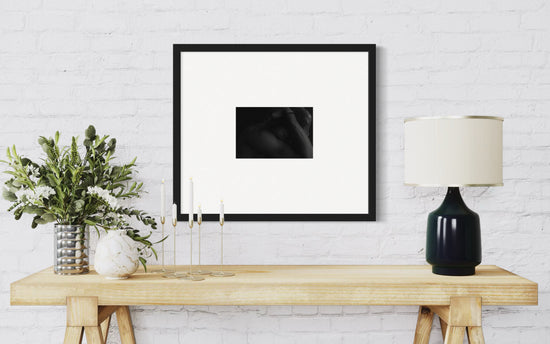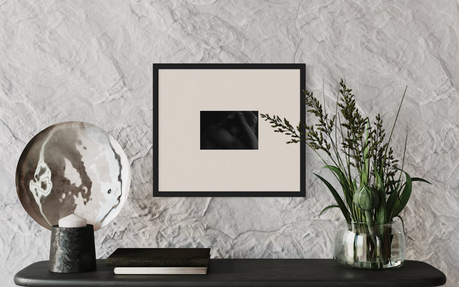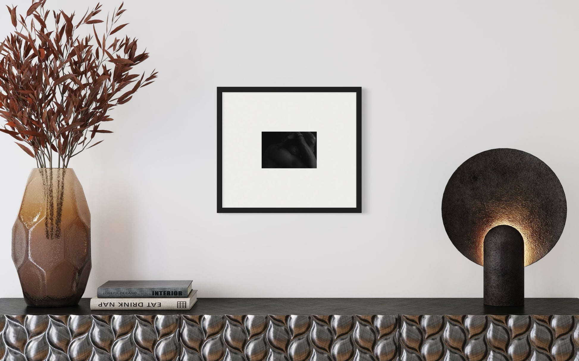 In this black-and-white photograph by Duda Breda, a nude male figure hides behind his intertwined arms, revealing only a single, watchful eye. The stark contrast between light and shadow isolates this glance, drawing the viewer’s focus to the subject’s guarded expression. This intimate framing generates a sensation of both intrigue and tension, reflecting the conflicting pressures of presenting strength while safeguarding inner vulnerability.