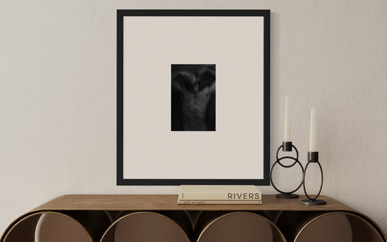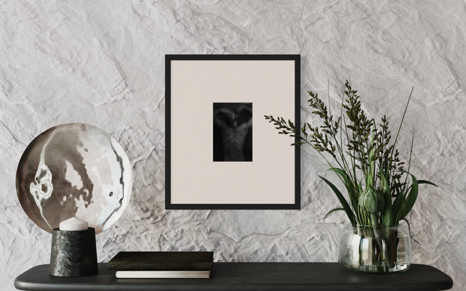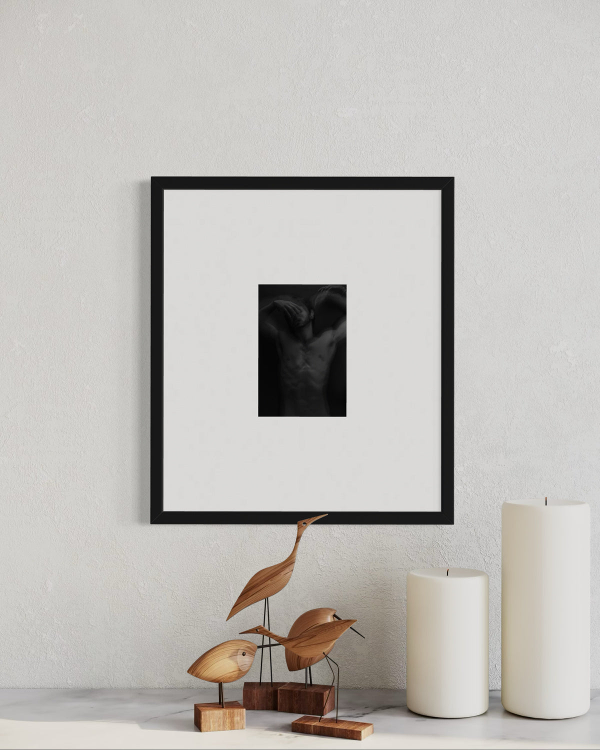 In this black-and-white photograph by Duda Breda, a nude male figure stretches across a dark backdrop, his arms raised overhead as one hand veils his eyes. The subtle motion blur envelops his torso and arms, creating a ghostly sense of fluidity. This visual distortion accentuates the tension between the subject’s physical form—rendered in dramatic tonal contrasts—and the introspective state suggested by his obscured gaze.