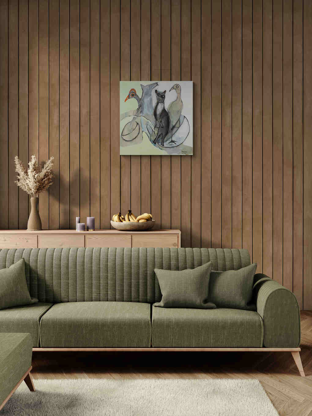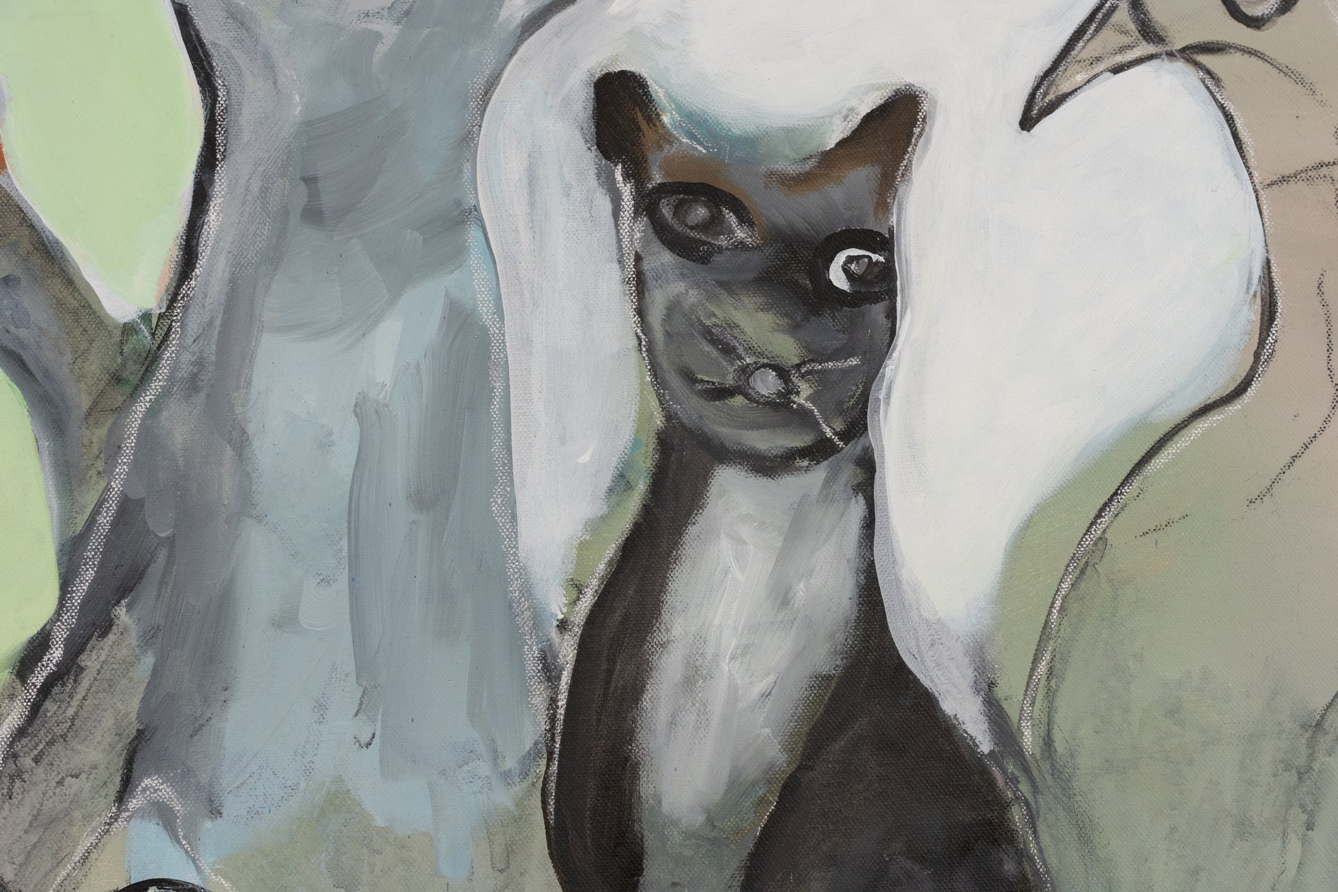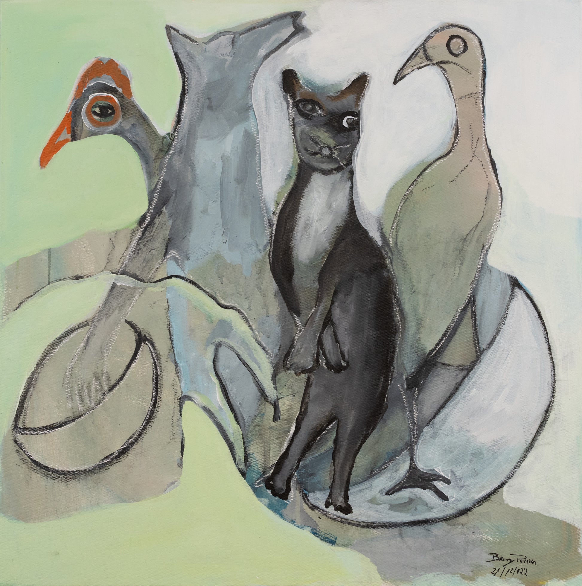 This painting presents a surreal assembly of animal figures—a bird, a cat, and a duck—merged with abstract elements and a soft, pastel background. The artwork explores themes of nature and mysticism through a whimsical lens.