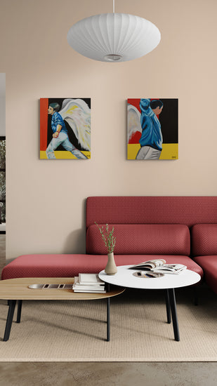 A striking portrayal of a figure with angelic wings, caught in motion. The bold contrast between the figure and the background highlights the sense of movement and the ethereal quality of the wings.