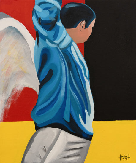 A powerful depiction of a figure in mid-motion, adorned with angelic wings. The bold, contrasting colors and dynamic composition convey a sense of freedom and aspiration.