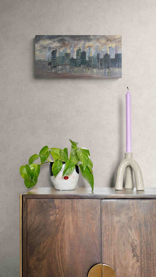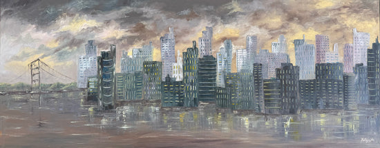 This wide canvas presents a sprawling cityscape bathed in the gloomy light of a setting sun, reflecting off a vast river that cuts through the scene. The city's architecture is depicted in muted tones, with skyscrapers reaching into a stormy sky. The use of a palette knife is evident, with bold, sweeping strokes that build the city's structures and the tumultuous clouds above. This technique adds a sense of movement and raw energy to the city, suggesting the bustling life within.