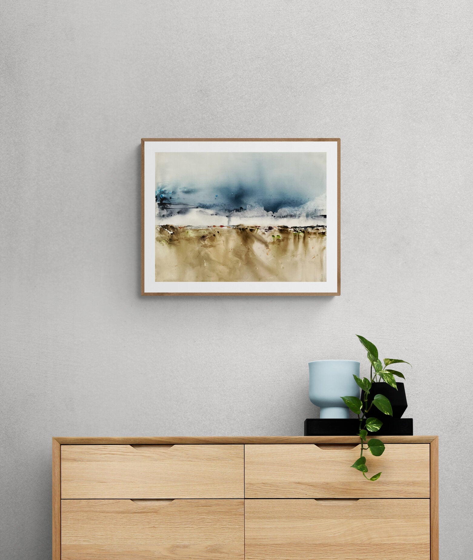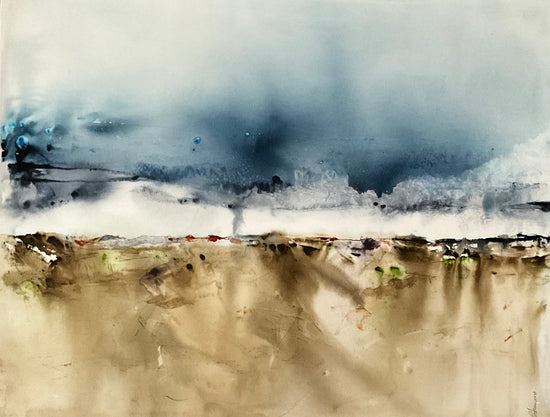 The ethereal beauty of an expansive landscape, where the earthy tones of the ground meet a brooding, misty sky. This watercolor painting on 300 gsm paper employs subtle gradients and delicate washes to evoke a serene yet dramatic atmosphere, inviting viewers to explore the depth and vastness of nature. The abstract representation allows for a personalized connection, as the viewer might see reflections of distant hills, stormy skies, or an open plain ready for discovery.