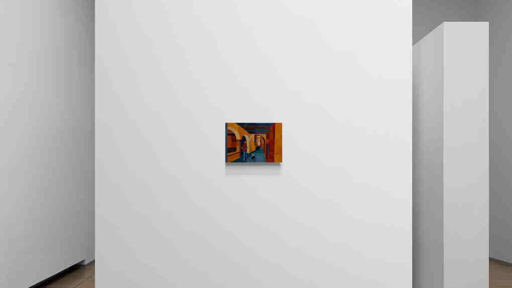 A vibrant scene of a person and a seagull beneath an archway, set in a colorful and dynamic alleyway. The use of bright colors and geometric shapes captures the lively essence of urban encounters.