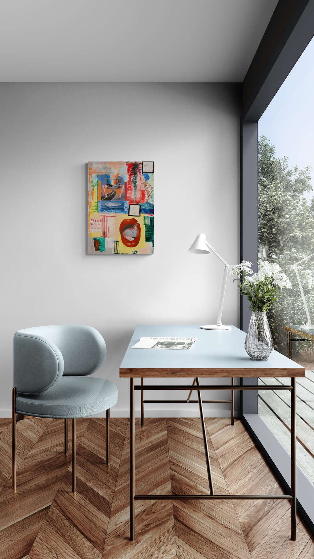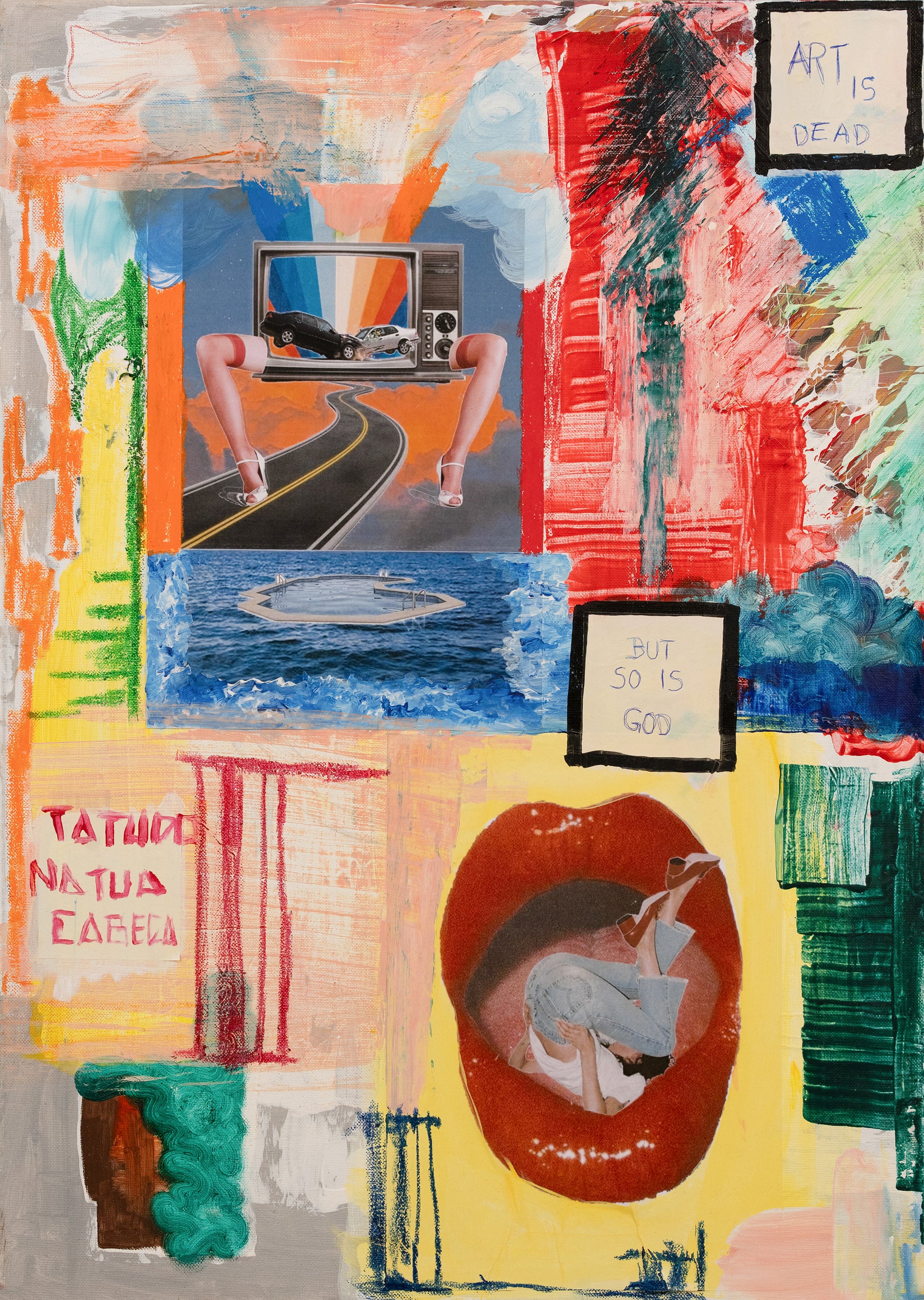 "Art is Dead" is a provocative collage that combines vivid paint strokes with eclectic images and text. The piece challenges conventional notions of art, using a mix of surreal elements and bold colors to create a thought-provoking and visually stimulating composition.