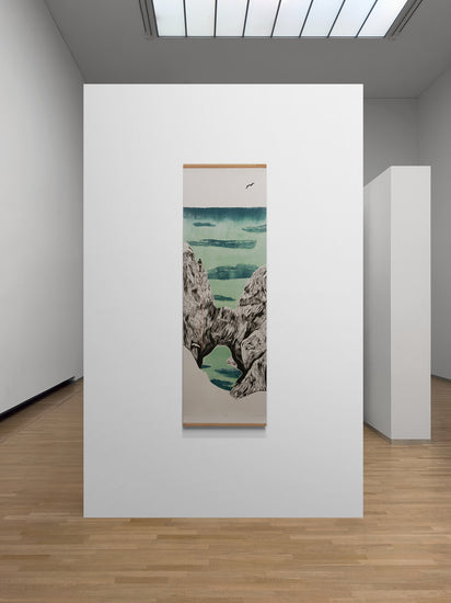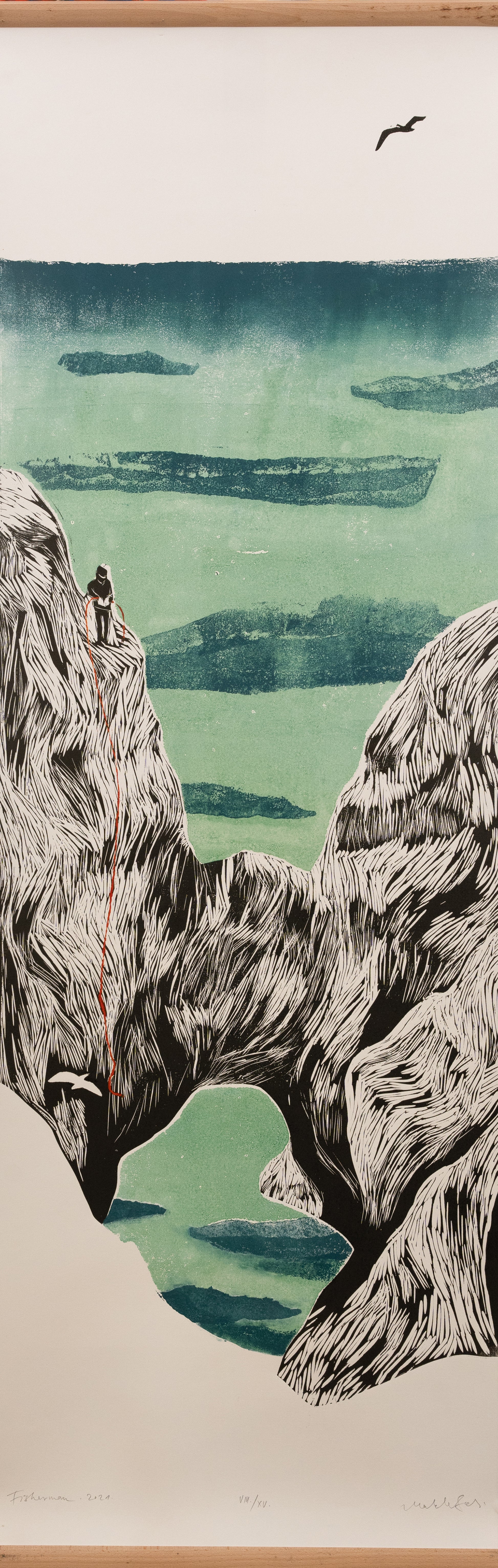 "Ascending Solitude" captures a serene yet adventurous moment as a lone climber ascends a rugged rock face against the backdrop of a tranquil, expansive sea. The red climbing rope stands out vividly, guiding the viewer's eye along the climber's path. Above, a solitary bird soars, emphasizing the vastness and peaceful isolation of the scene.
