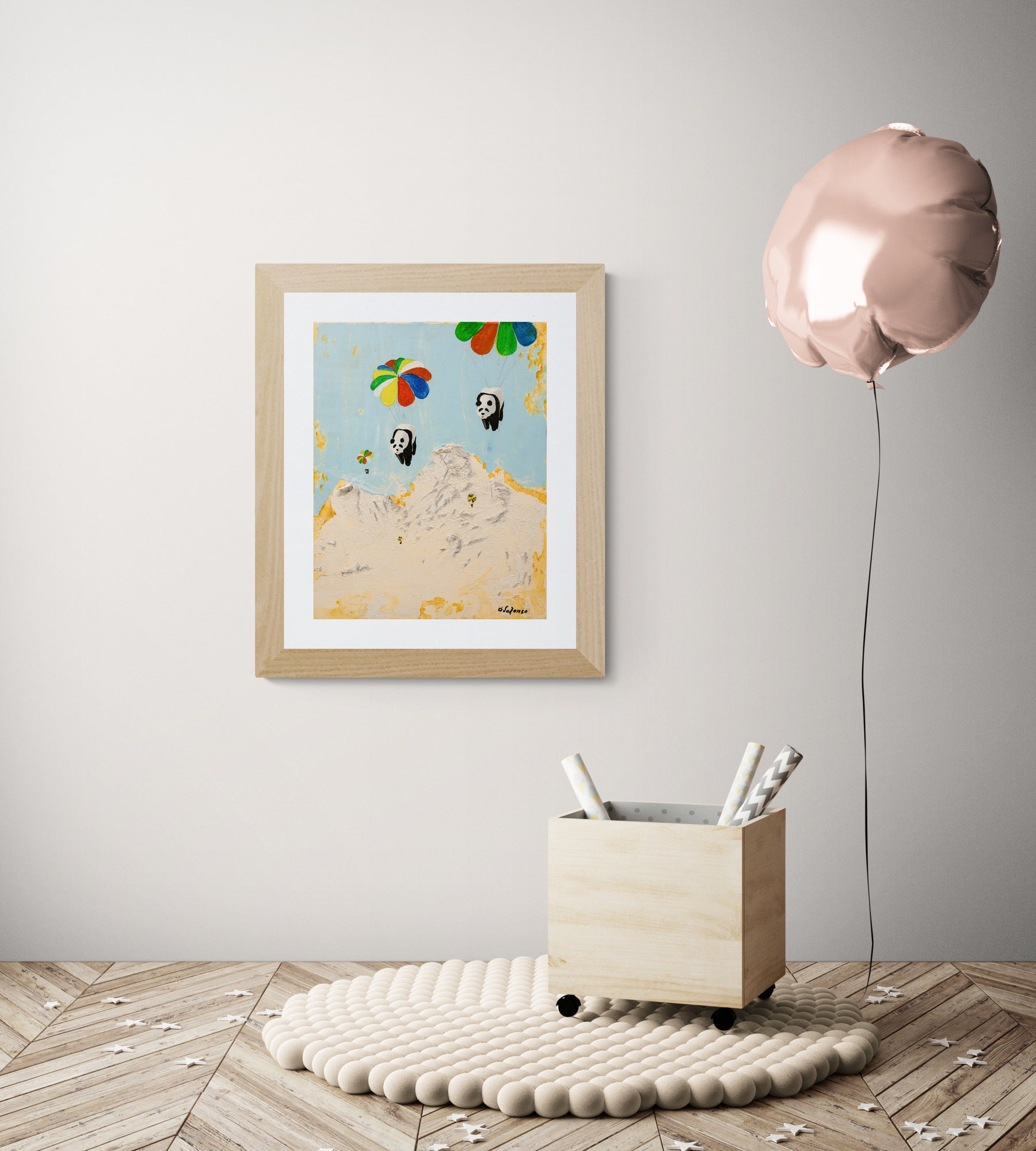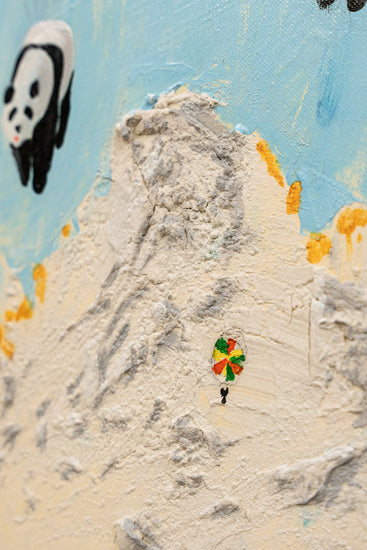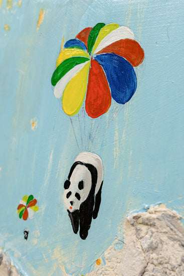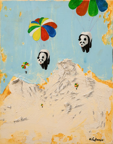 Playful pandas dangle from colorful parachutes, ascending over a textured mountain landscape under a serene sky.