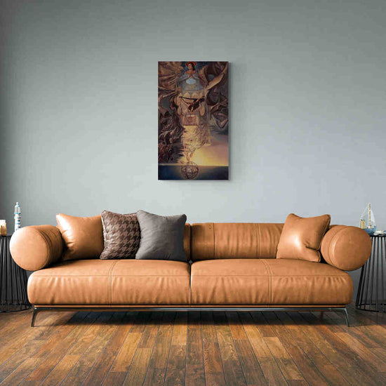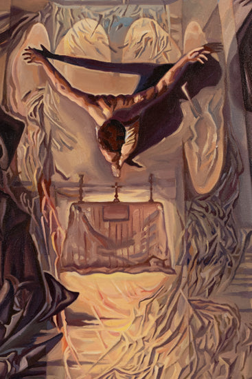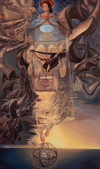Copia de Salvador Dali. This deeply allegorical painting depicts a spiritual ascension, where a central figure is elevated towards a heavenly realm, guided by angelic figures and enveloped in a cascade of ethereal fabrics and mystical symbols. The lower section shows earthly ties gradually unraveling as the figure rises. The top of the composition is dominated by a serene, saint-like figure, representing enlightenment or divine insight, framed by a luminous halo.