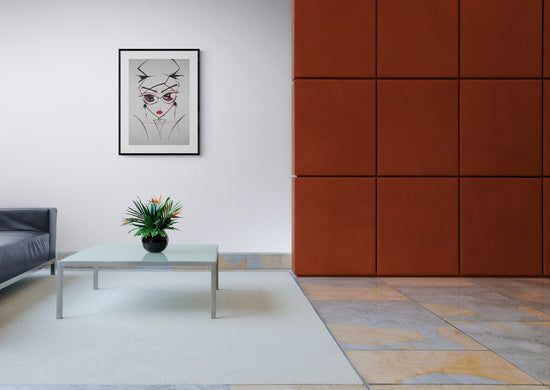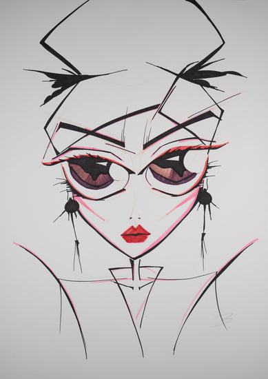 Her makeup is dramatically emphasized, with smoky eyes and vibrant red lips, complemented by striking earrings, all set against a minimalist, stylized collar.