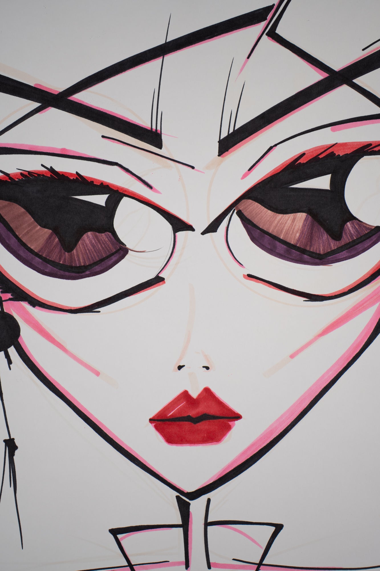 The artwork presents a woman with a modern, geometric hairstyle and angular sunglasses.
