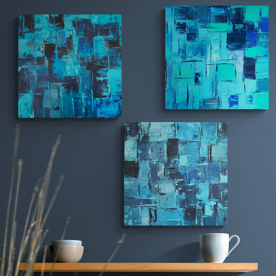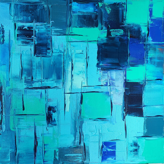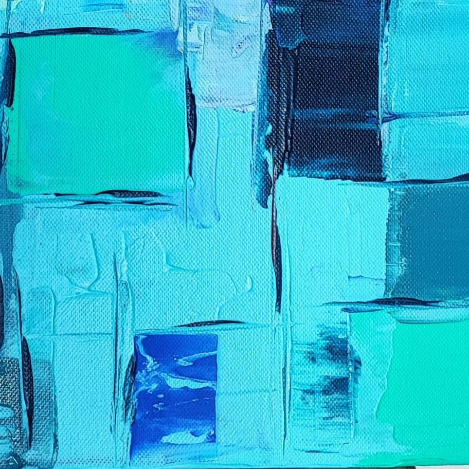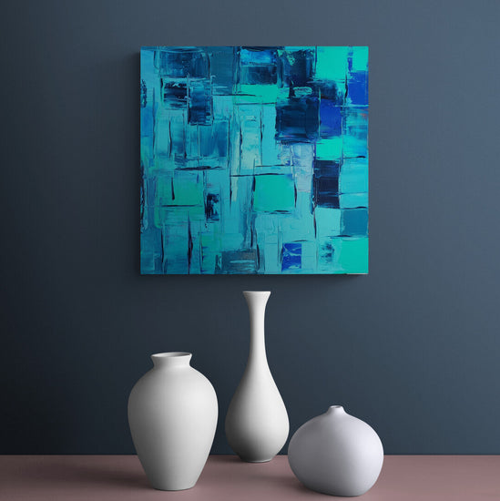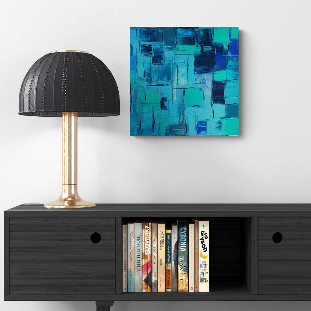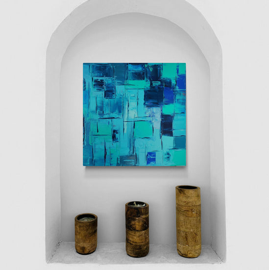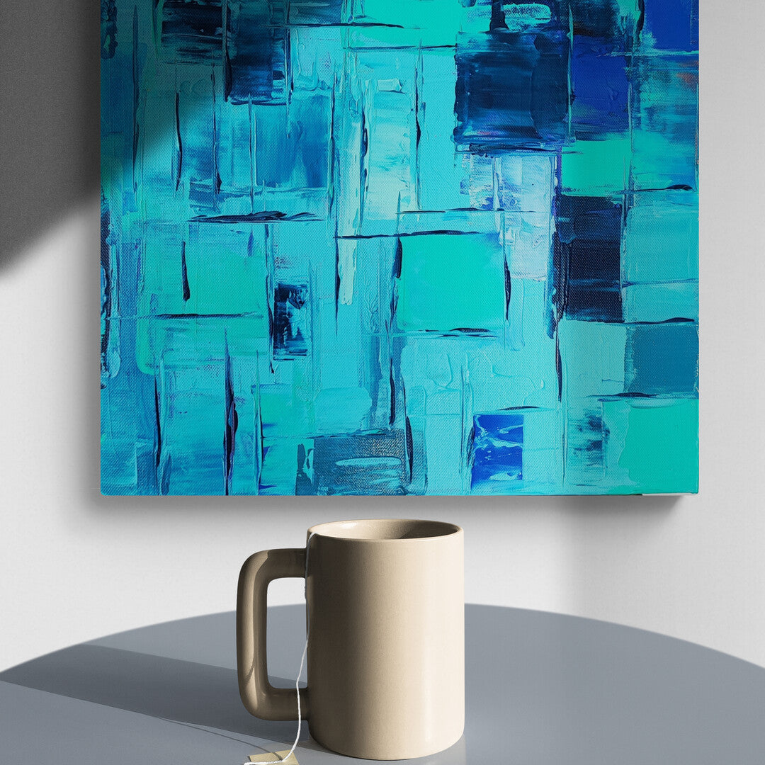A captivating abstract artwork inspired by the shades of the ocean and sky. This piece combines layers of cool blues and aquas with geometric forms, creating a sense of depth and tranquility.