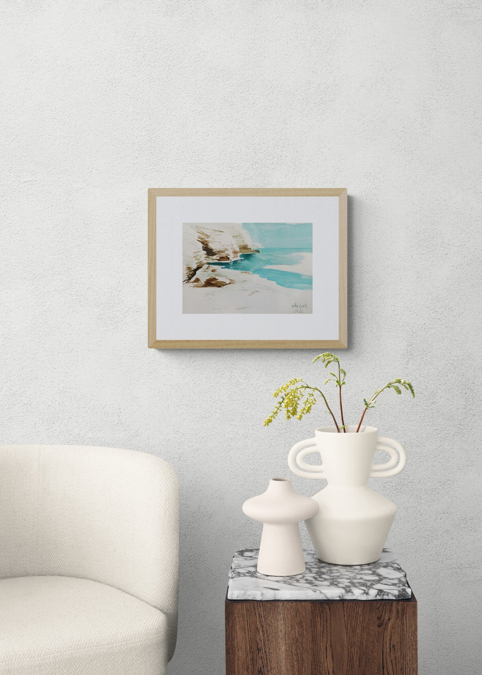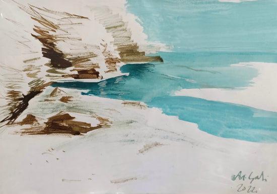 This calming watercolor and ink painting captures the essence of a secluded coastal cove. The artist uses soft, fluid brushstrokes of turquoise and earth tones to depict the meeting of land and sea. The layered textures of the cliffside contrast with the smooth, flowing waters, evoking a sense of peaceful solitude. The composition, with its serene blues and delicate brown hues, draws the viewer into a tranquil moment by the ocean, where time seems to stand still.