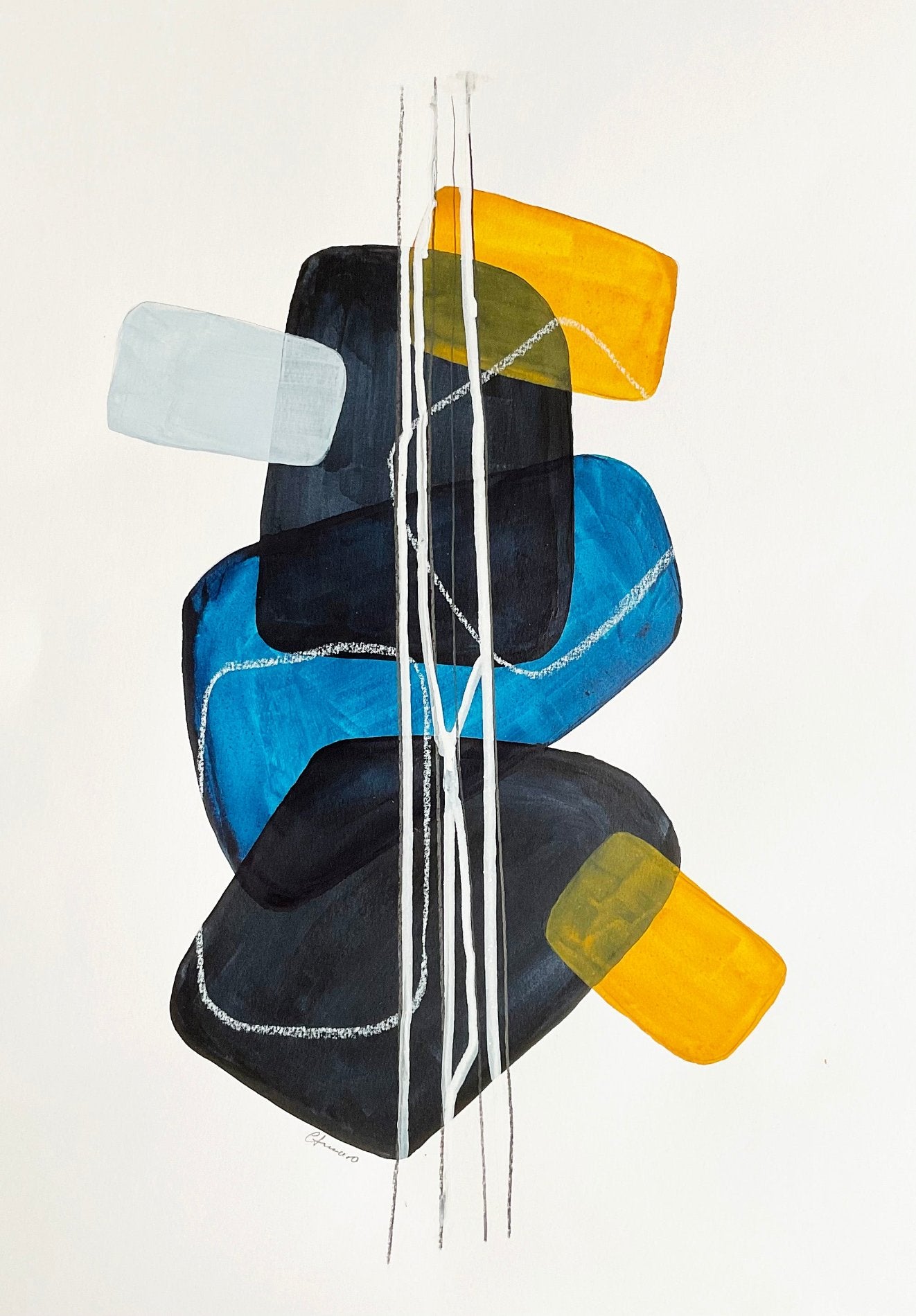 Balance I #1 explores a harmonious arrangement of organic shapes layered in cool blues, blacks, and warm golden tones. This abstract composition employs soft-edged rectangles and overlapping forms to create a sense of stability, while vertical white lines add movement and structure. The juxtaposition of opaque and translucent colors brings depth, echoing a tranquil yet dynamic equilibrium. The artwork invites reflection on balance and contrast within both composition and concept.