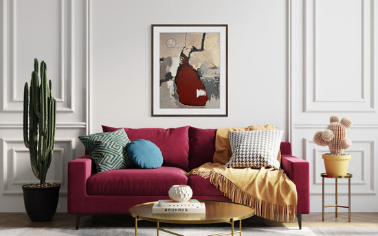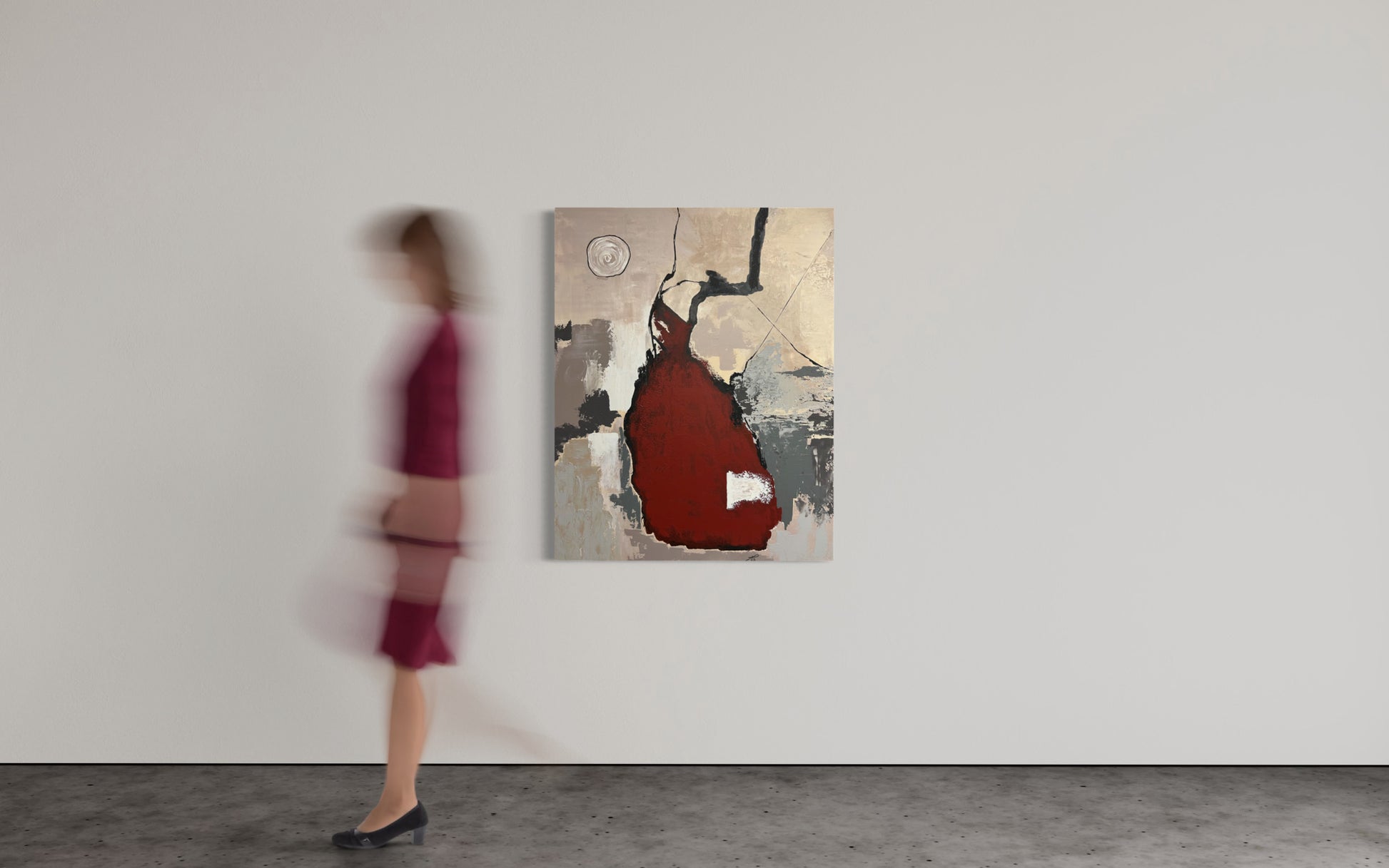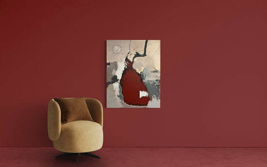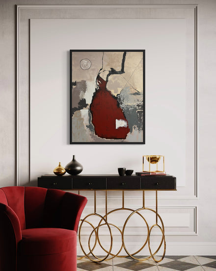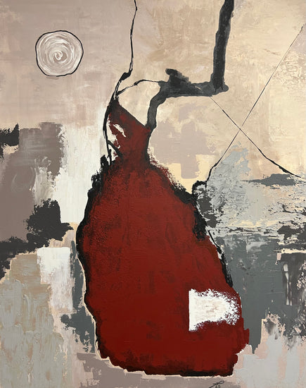 Bailado unfolds as a dance of forms and textures, where bold abstraction meets quiet emotional resonance. A deep red central shape seems to pulse with movement, balanced by earthy neutrals and expressive black lines that sweep upward like gestures in motion.