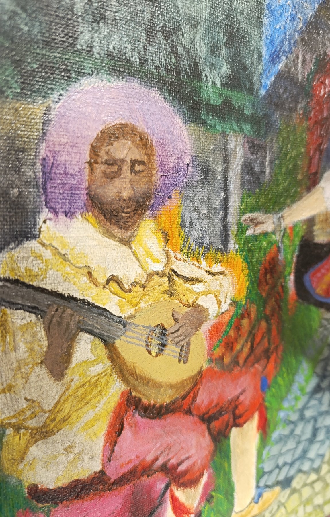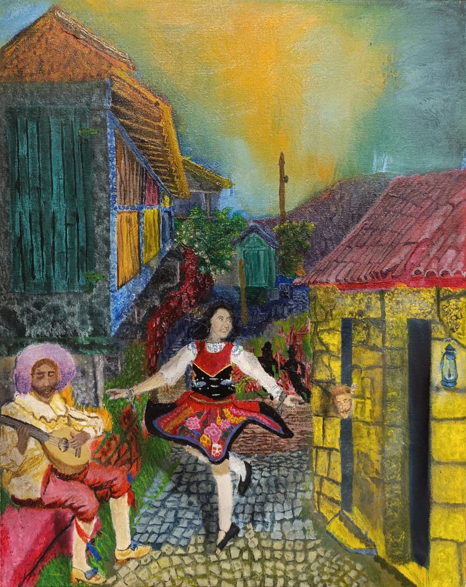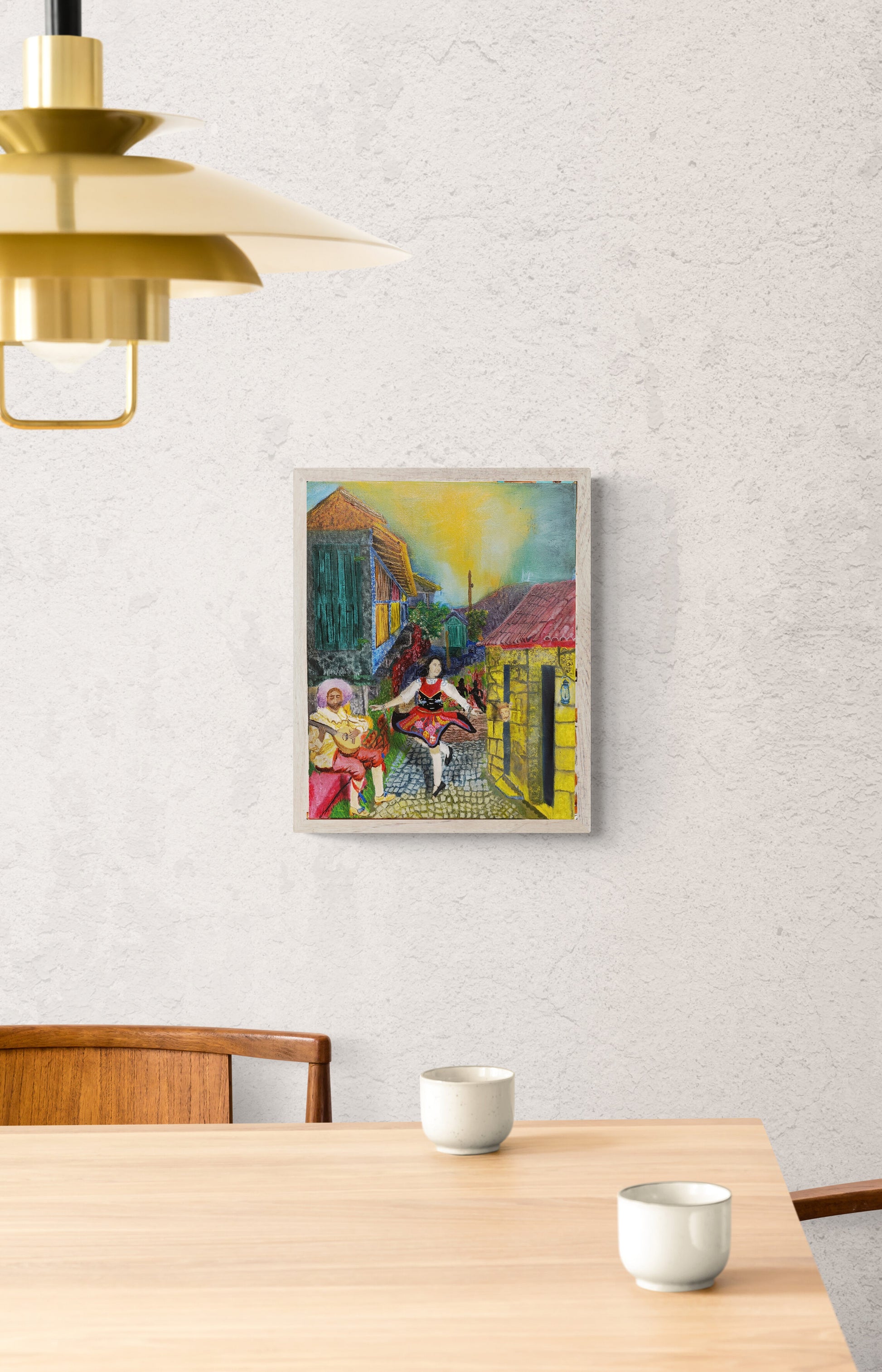 is a lively and colorful depiction of a traditional village celebration, bursting with cultural vibrancy. The painting features a dancer in the foreground, twirling in an intricately embroidered red and black dress, her movements full of energy and joy. A musician sits nearby, playing a stringed instrument, adding rhythm to the scene. The rustic village setting, with its vibrant yellow and green houses and cobblestone streets, enhances the festive atmosphere. The warm, glowing light in the background hints at a sunset, symbolizing the end of a joyous day. This piece captures the essence of traditional celebration and the communal spirit of village life.