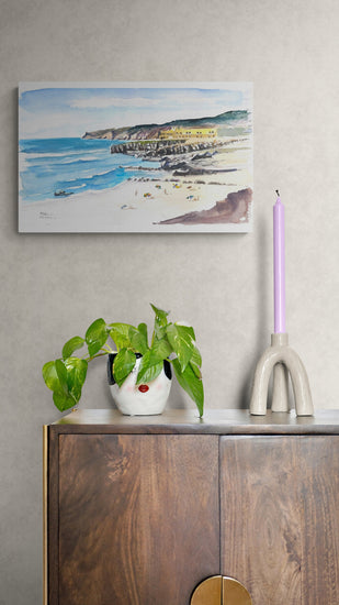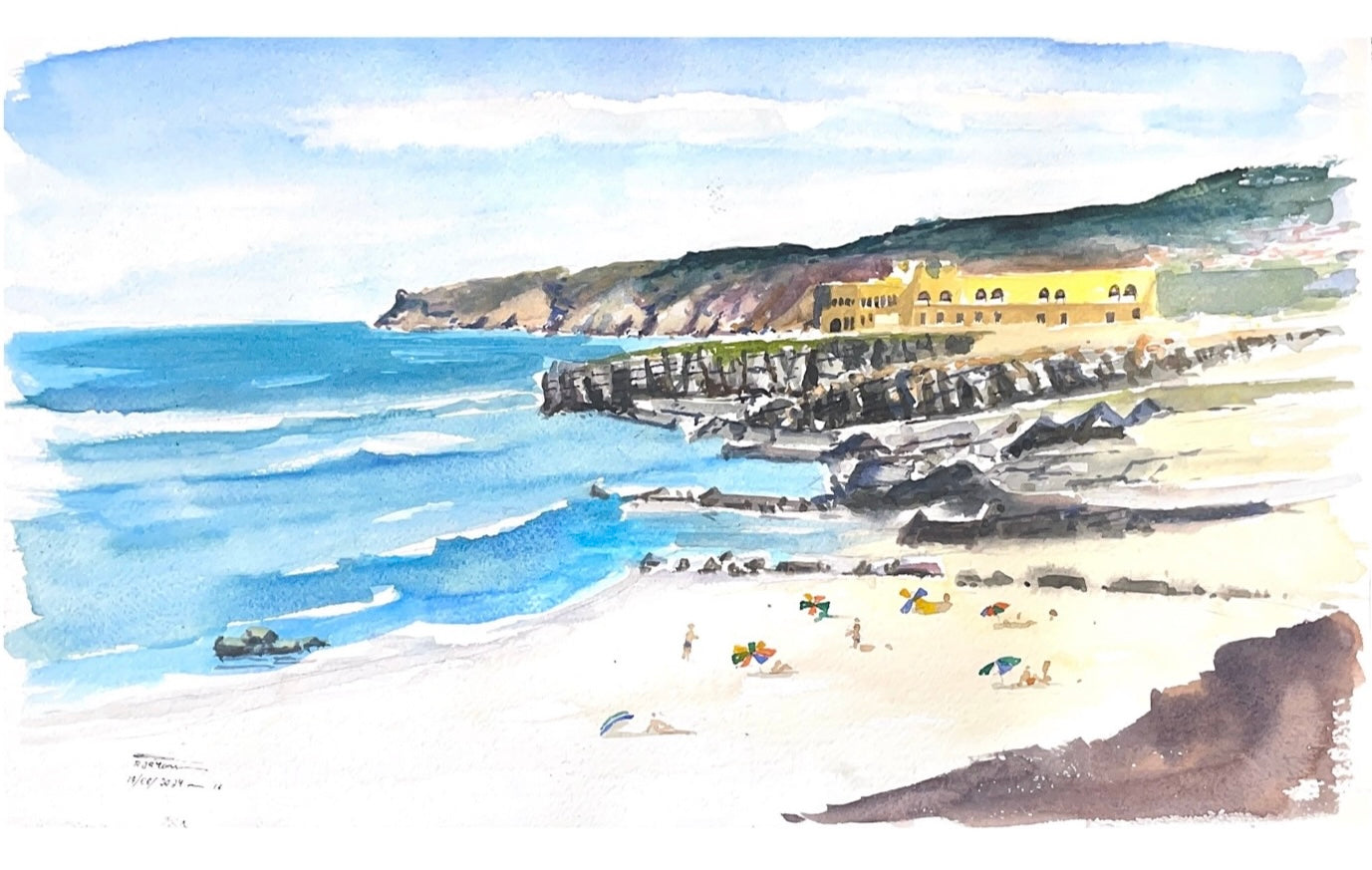 This painting illustrates a serene beach scene with gentle waves lapping against the shore. The beach is dotted with colorful umbrellas and relaxed beachgoers, enjoying the sunny day. In the distance, cliffs and a rocky coastline add texture and depth to the idyllic setting.