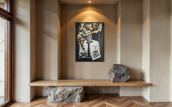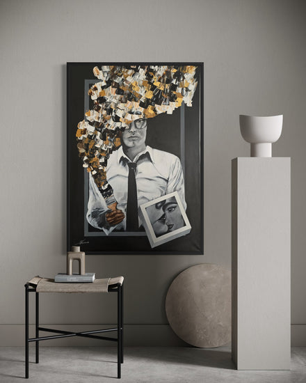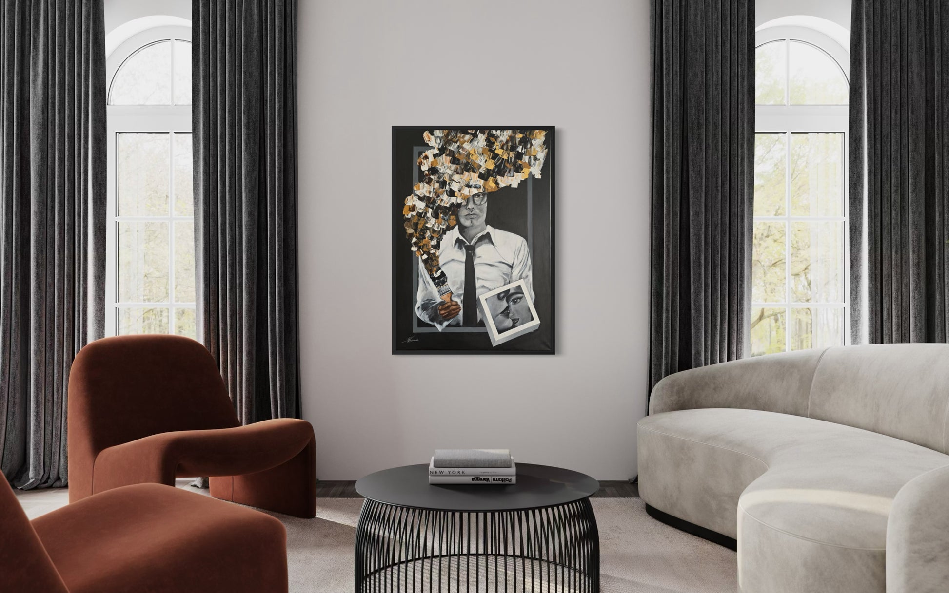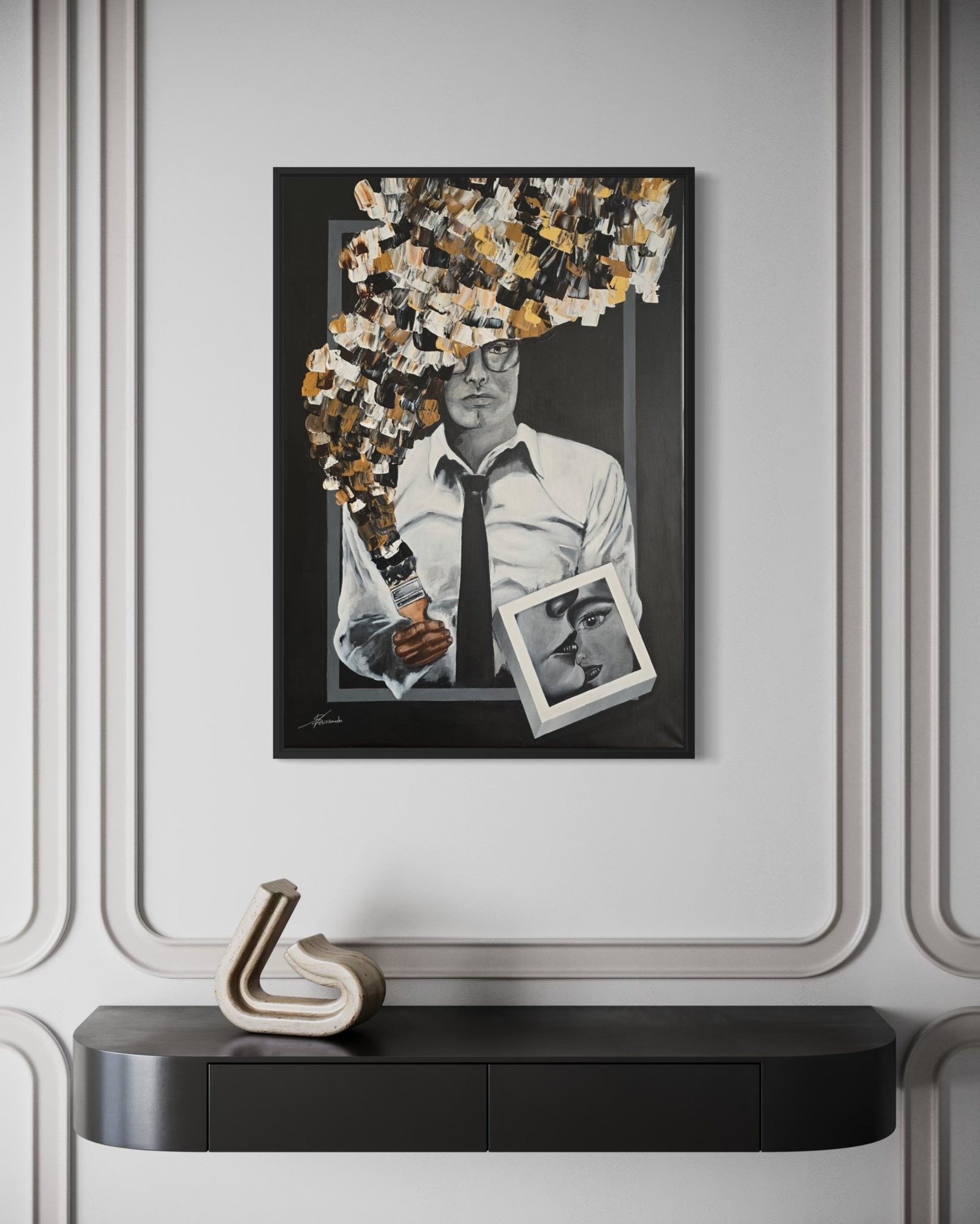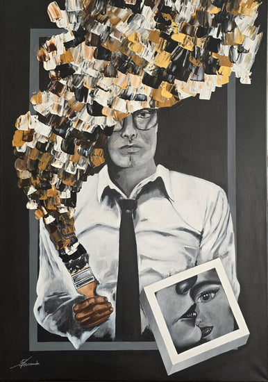 Entre Vidas explores the complex duality of identity and expression—the life we present and the life we paint into existence. The figure, rendered in grayscale, stands partly obscured by an eruption of vivid textured brushstrokes, suggesting thoughts, memories, or alternate selves spilling into reality. The brush in hand becomes a symbolic bridge, allowing inner worlds to take form. A small framed image at the bottom right reflects a tender, intimate connection—an inner narrative quietly held within.