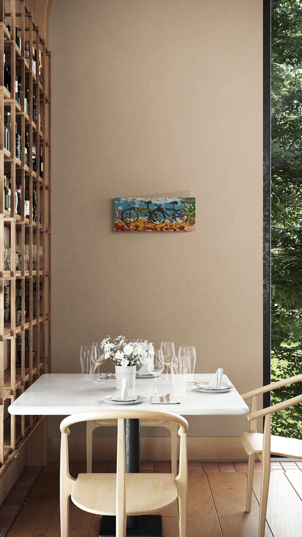It depicts a pair of bicycles resting against a backdrop of vibrant blue water and lush greenery. The bold, expressive brushstrokes and vivid colors capture the essence of a carefree day spent by the lake, evoking a sense of nostalgia and simple joys.