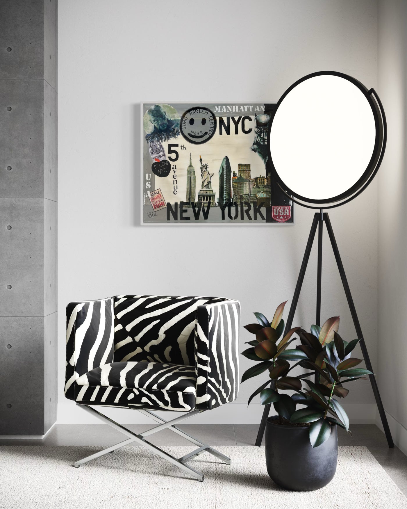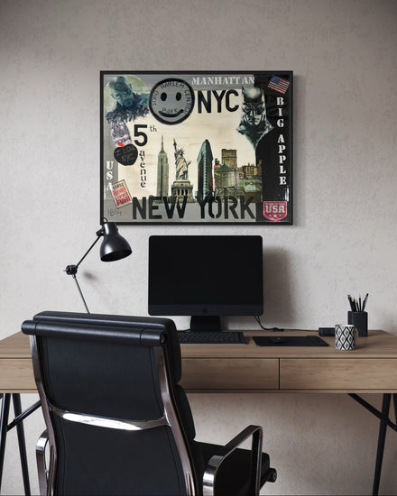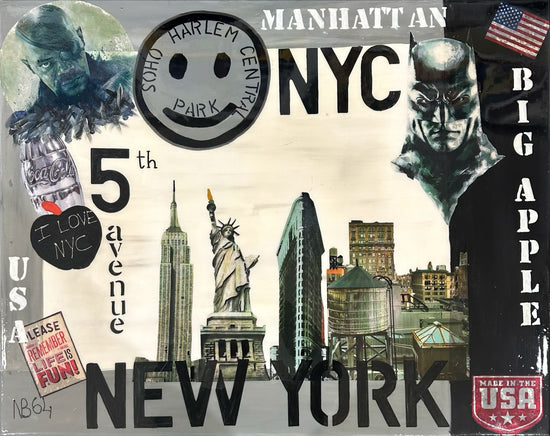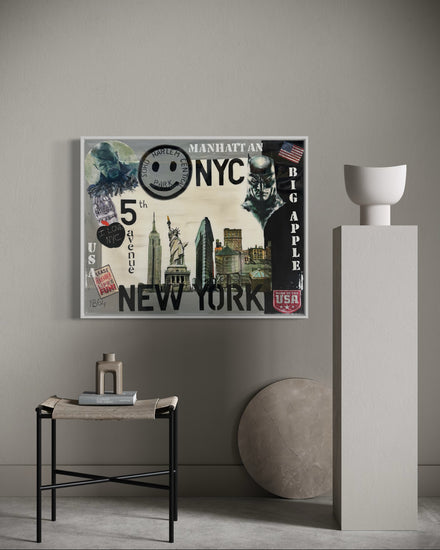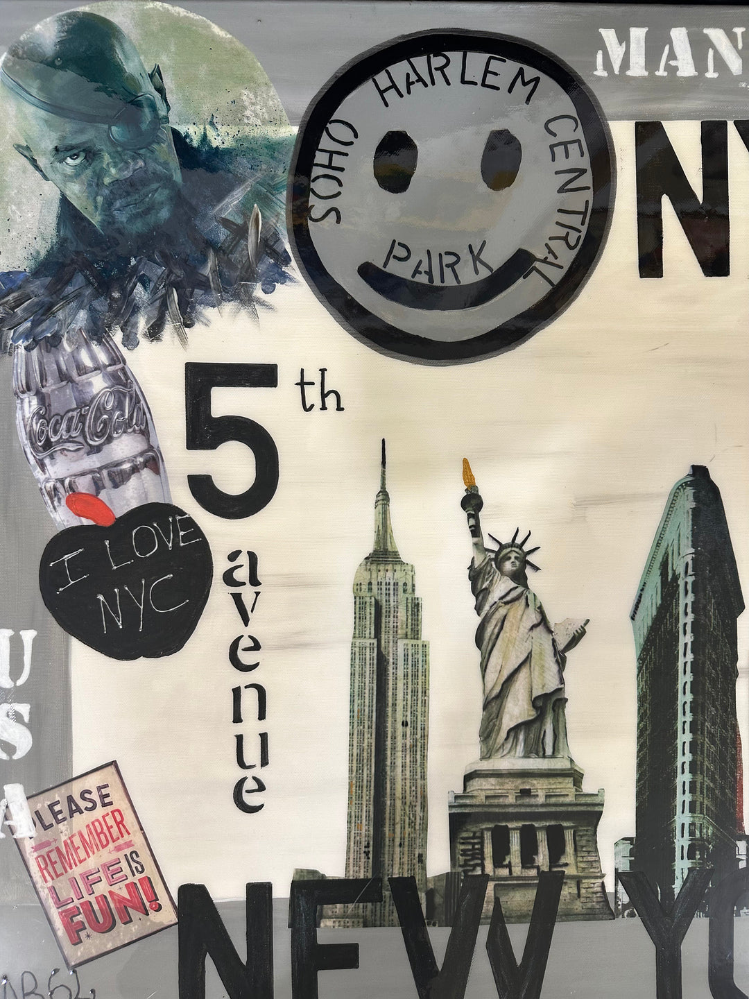 A bold mixed-media tribute to the energy of New York City, blending iconic landmarks with pop culture elements.
