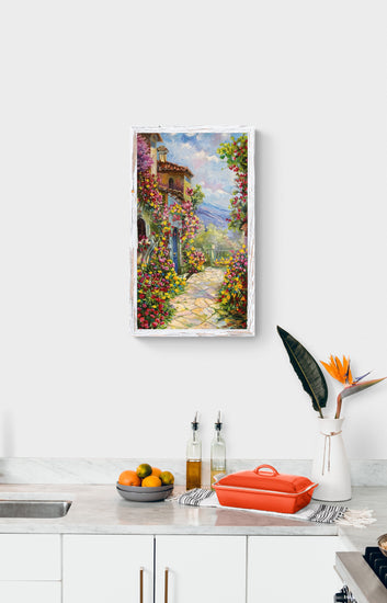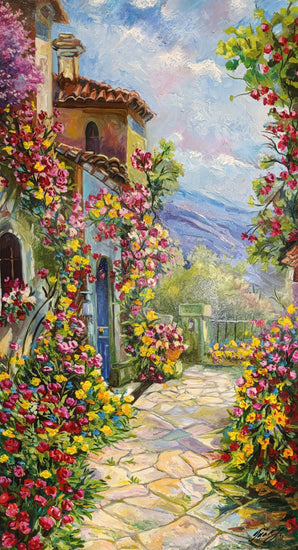 Charming mediterranean-style villa, framed by lush greenery and blooming vines. The artist capturing the essence of a sun-drenched day in a picturesque garden. Ideal for brightening any space, this piece adds a touch of warmth and the joyful beauty of nature, inviting viewers to take a stroll through this blooming paradise.
