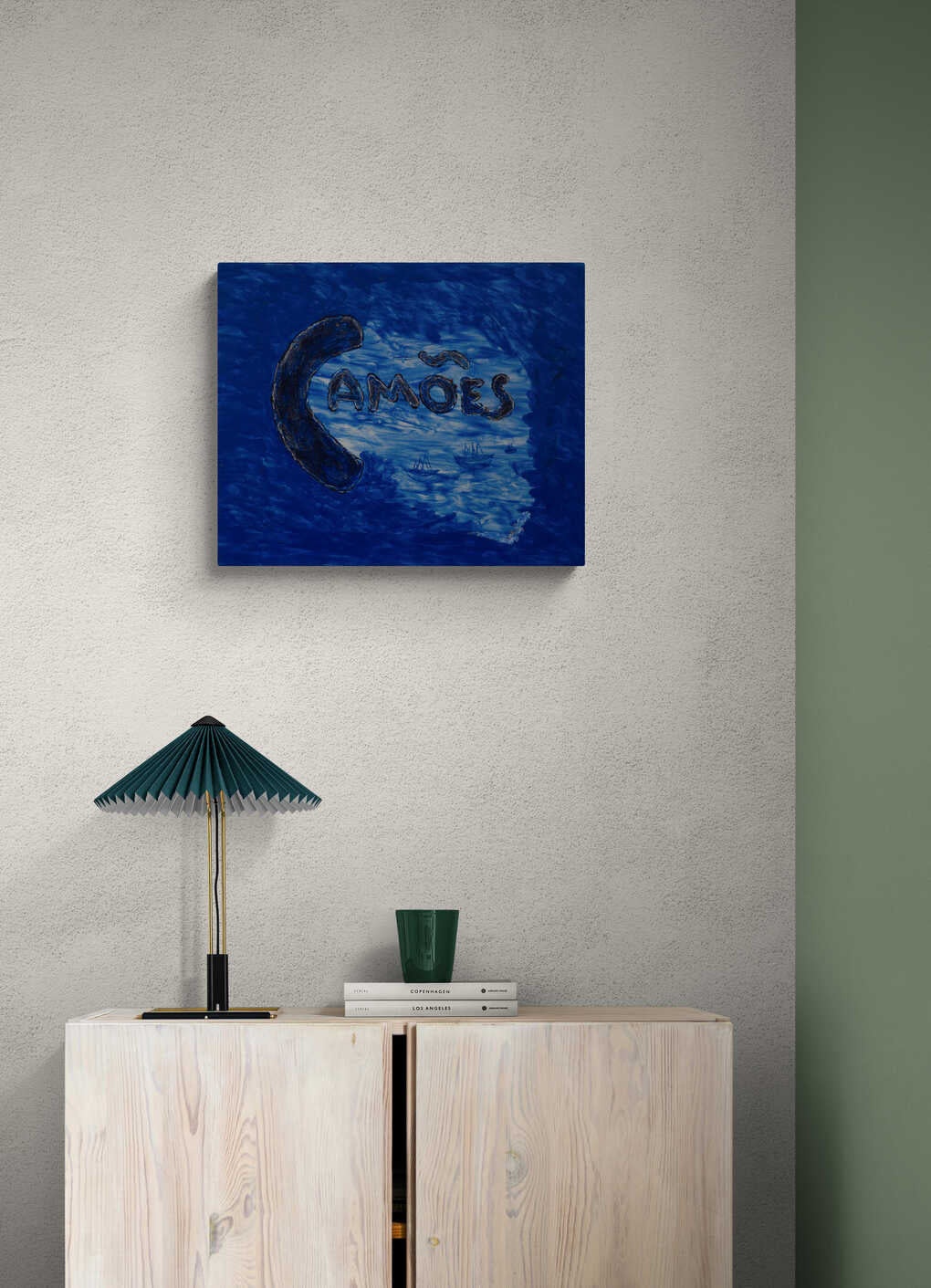 This abstract piece features the word "Camoes" amidst a deep blue sea-like background with subtle ship motifs. The swirling patterns and rich colors evoke a sense of mystery and depth.