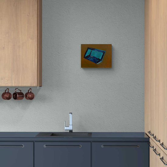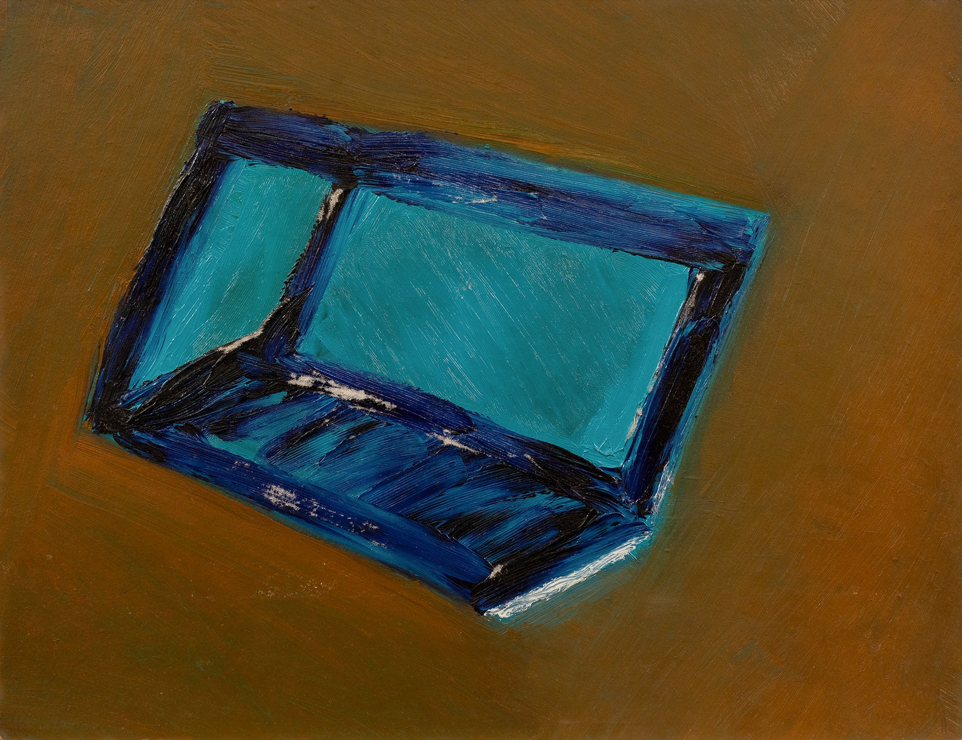 An abstract depiction of a window using bold, textured brushstrokes and a limited color palette. The contrast between the blue and brown tones adds depth and intrigue to the piece.