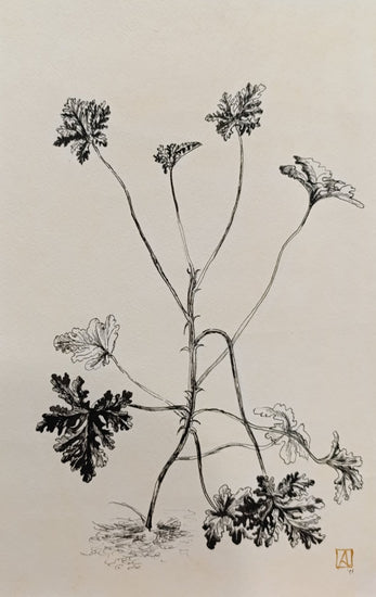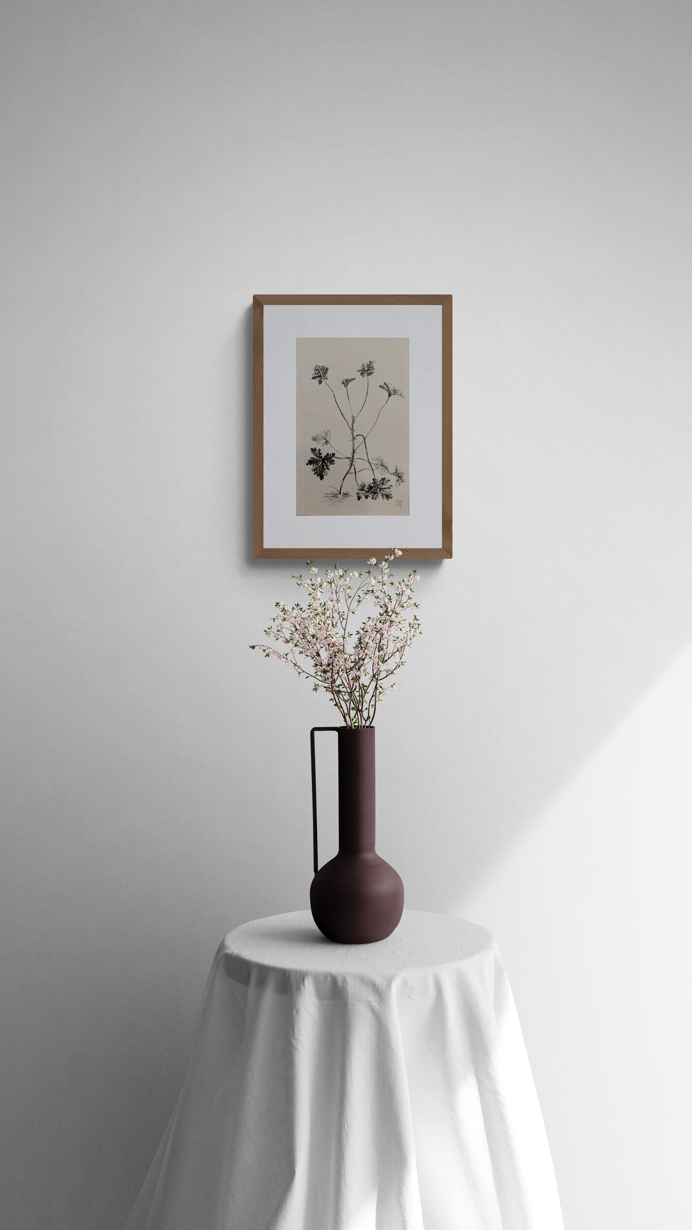 This detailed ink drawing showcases the delicate structure of a herbaceous plant, reminiscent of classical botanical illustrations. With each intricate line, the artist captures the fragile beauty of nature in its purest form. The thin, winding stems lead the eye upward to intricately drawn leaves, celebrating the simplicity and grace of plant life. The minimalistic background allows the viewer to focus entirely on the subject, making this piece perfect for those who appreciate scientific art and the elegance of flora. Inspired by traditional botanical studies, this artwork seamlessly blends art and nature, making it an excellent addition to any collection that values the intersection of aesthetics and knowledge.