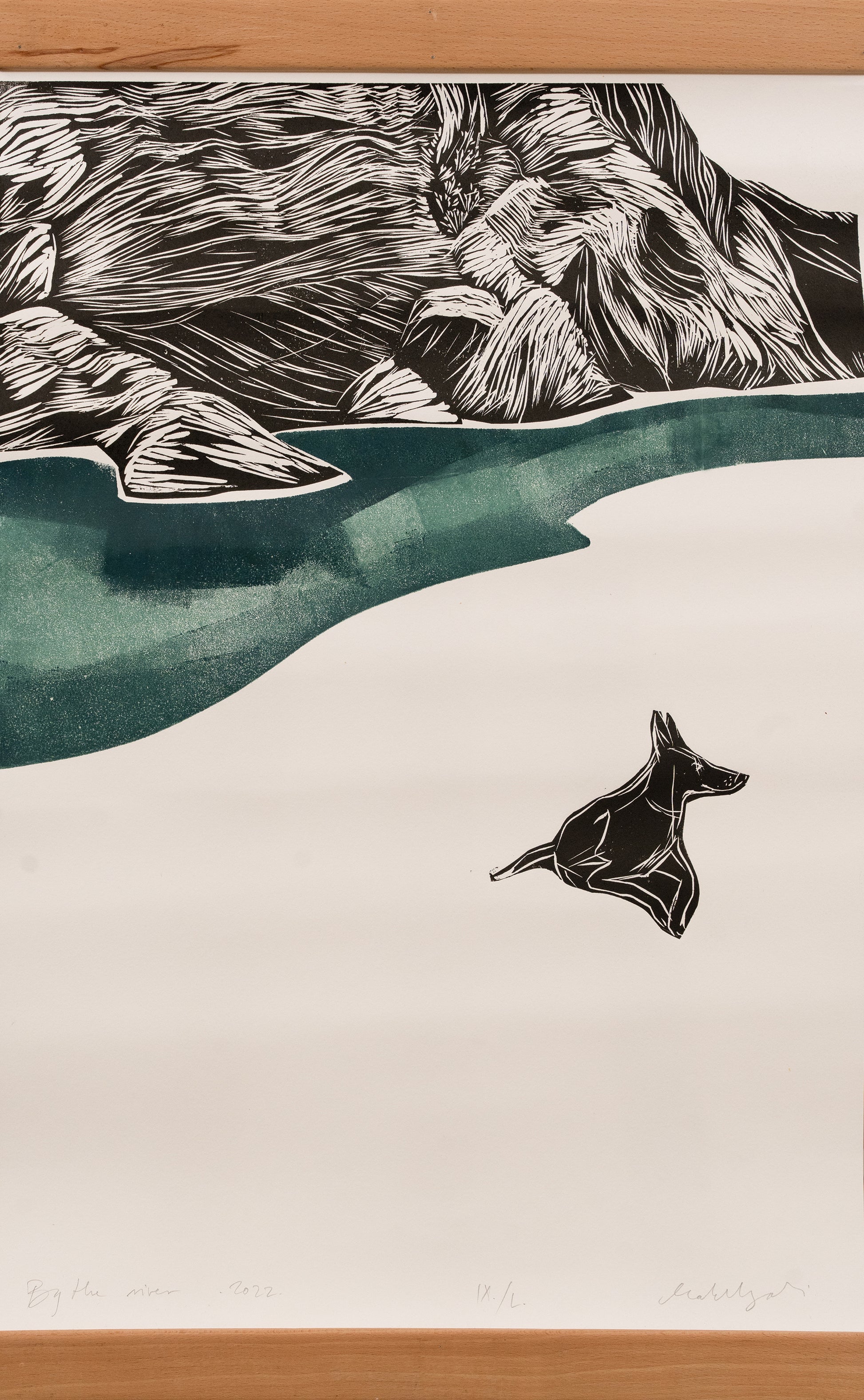 "By the River" is an evocative painting that combines elements of both nature and minimalism. The artwork features a striking contrast between the detailed, rugged landscape of rocky mountains and a serene river, rendered in textured shades of green. A small, stylized dog figure, drawn with bold lines, appears to be playfully running along the riverbank, adding a whimsical touch to the composition. The painting invites viewers to ponder the interaction between the wild, untamed natural world and the simplicity of joyful moments.