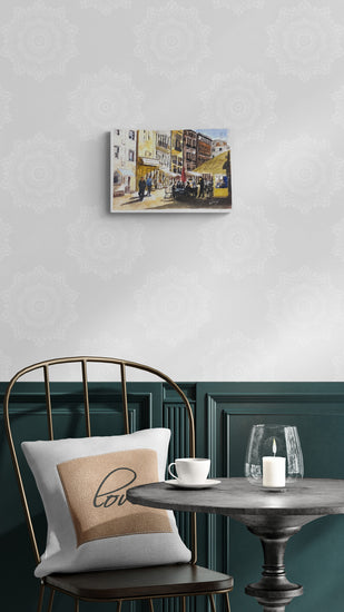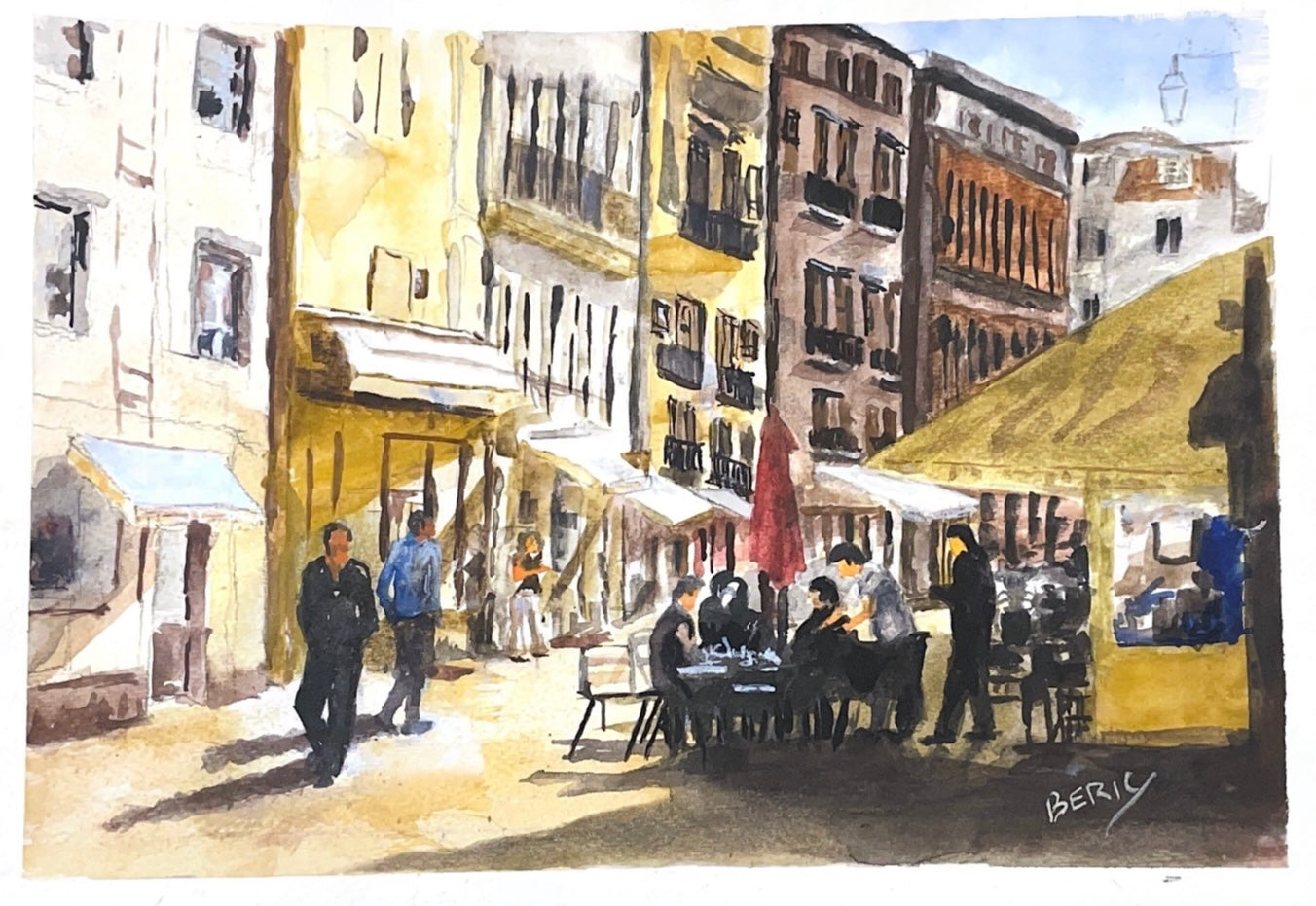 This painting captures the lively atmosphere of a city café, with people sitting at tables under the awnings of a historic building. The warm, earthy tones of the architecture and the casual, animated figures of the patrons convey a sense of everyday life and social interaction in an urban setting.