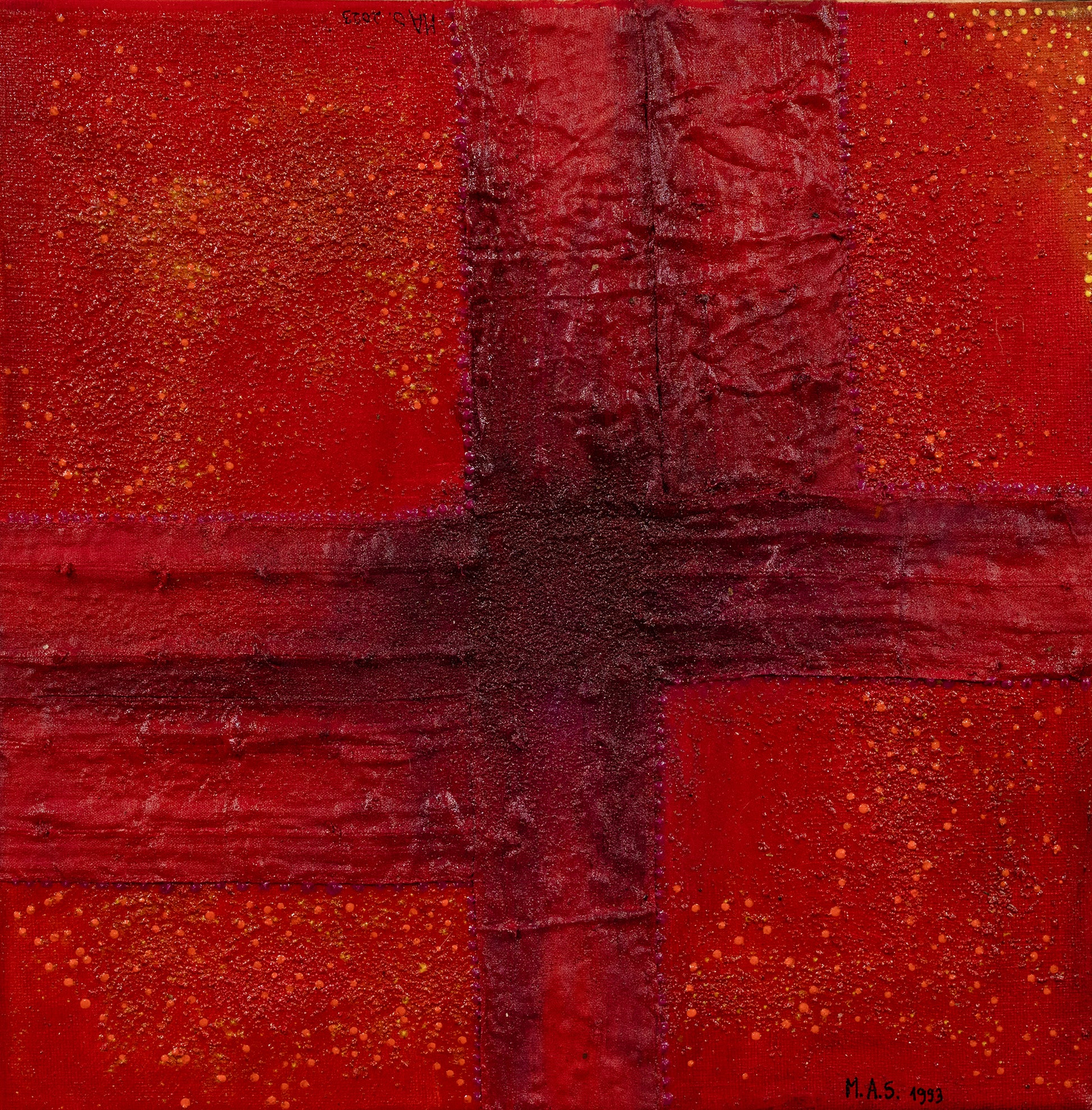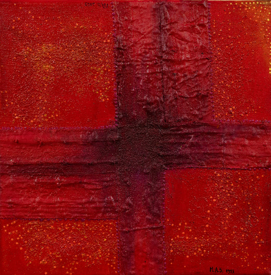 delves deeper into the intricate patterns and rich textures of red. The layering of materials and thoughtful composition highlight the complexity and beauty of abstract art.