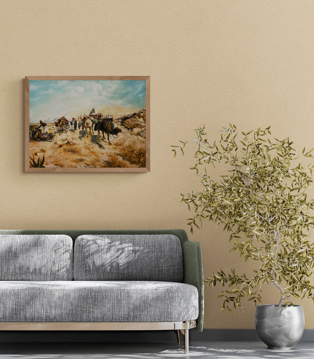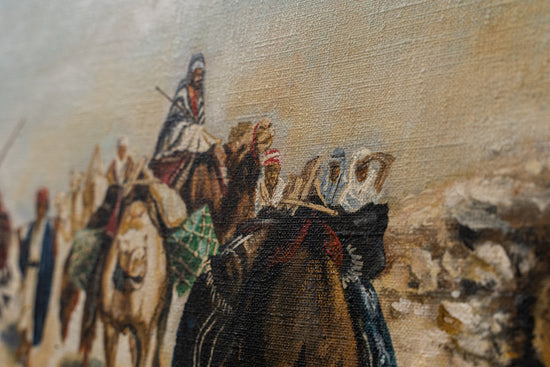 This evocative painting captures a scene of a caravan journey through a desert landscape. A group of figures adorned in traditional garments guide their camels over the sandy terrain, with some riding atop the animals while others walk beside them.