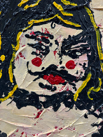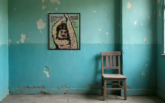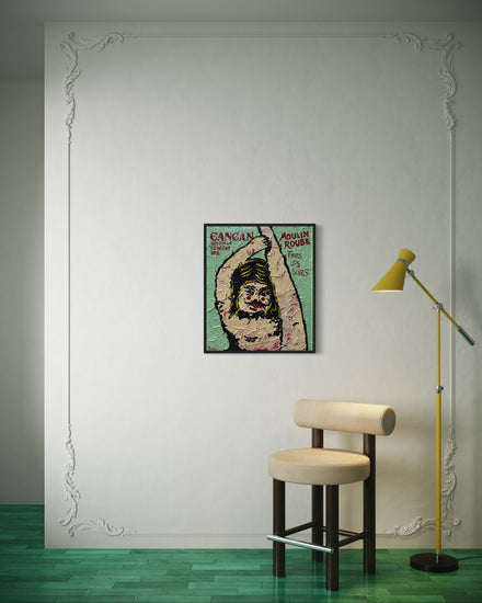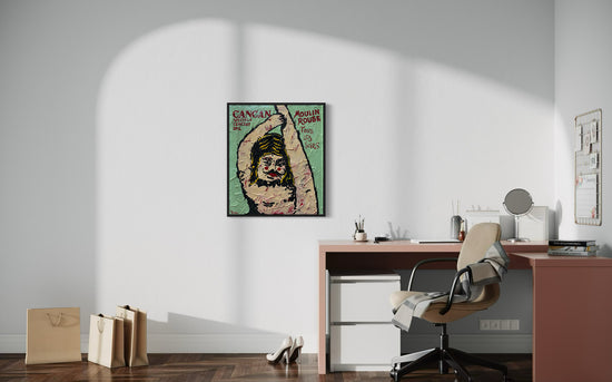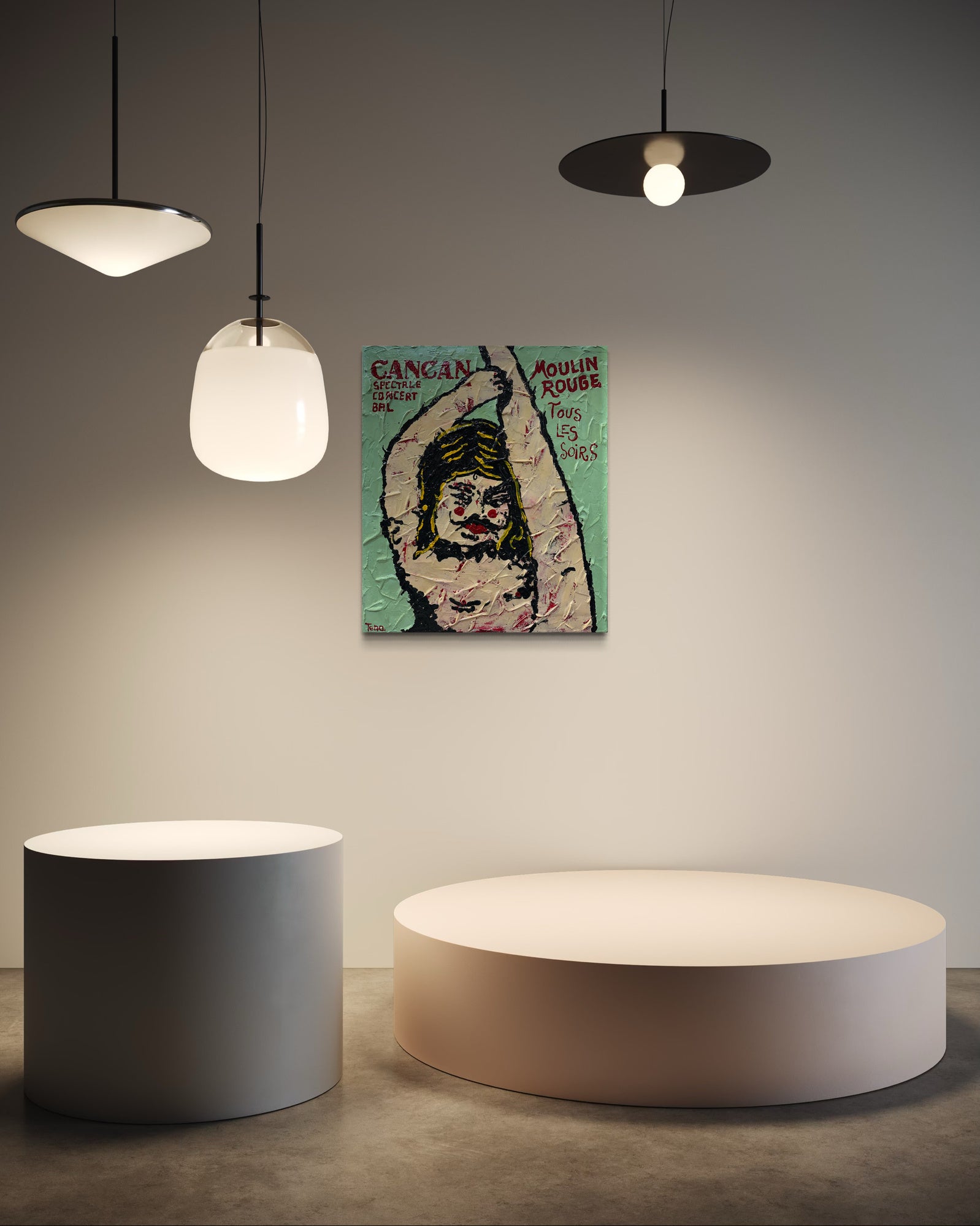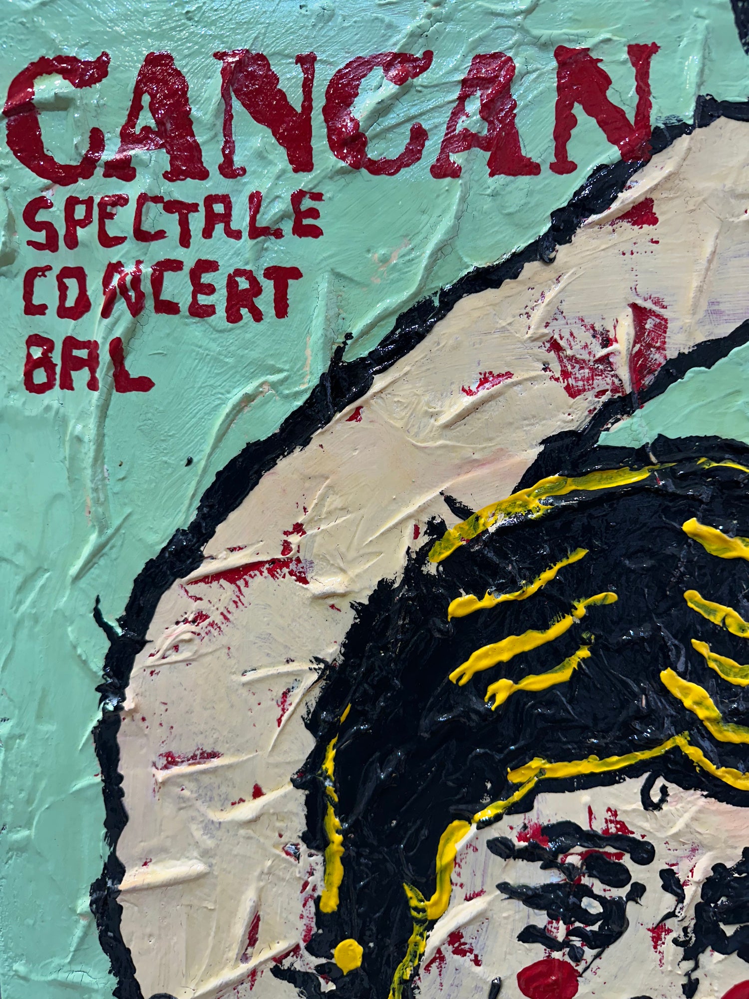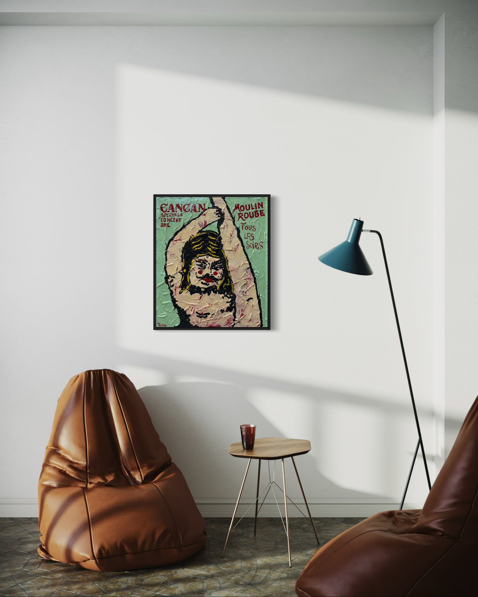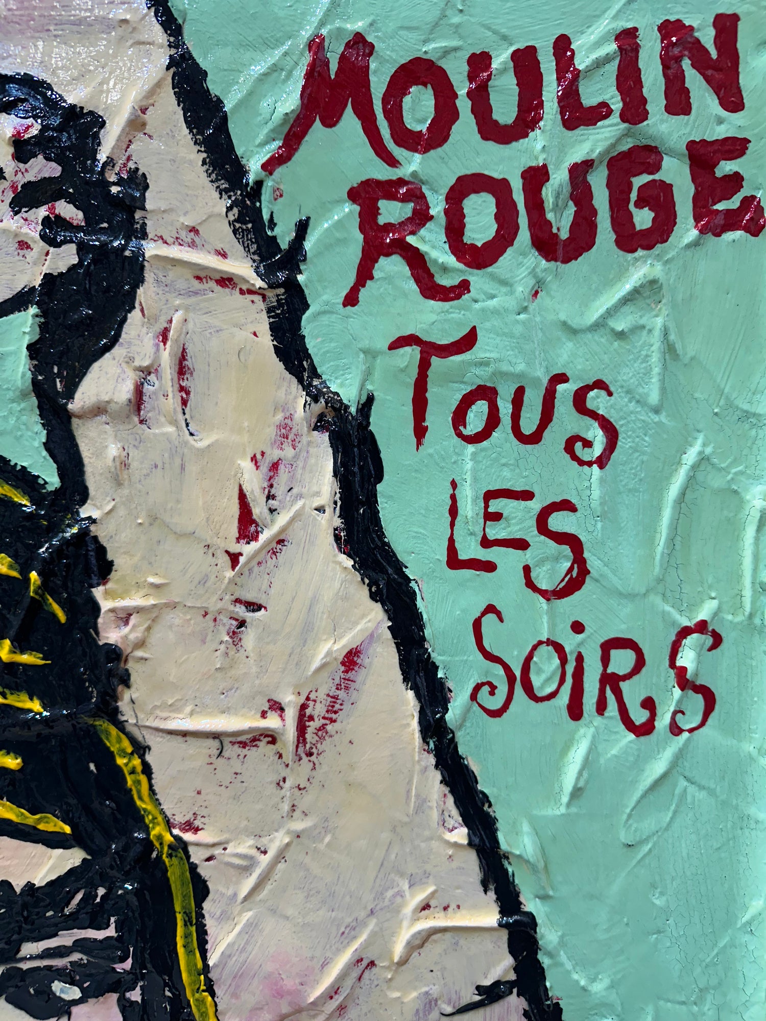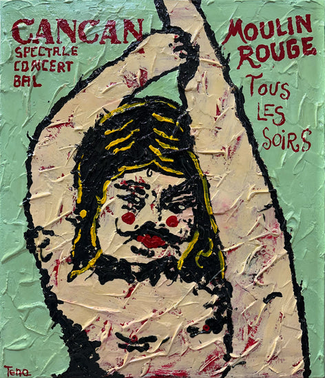 A pop-art reinterpretation of classic Moulin Rouge poster imagery, featuring a heavily textured depiction of a cancan dancer framed by bold text elements.