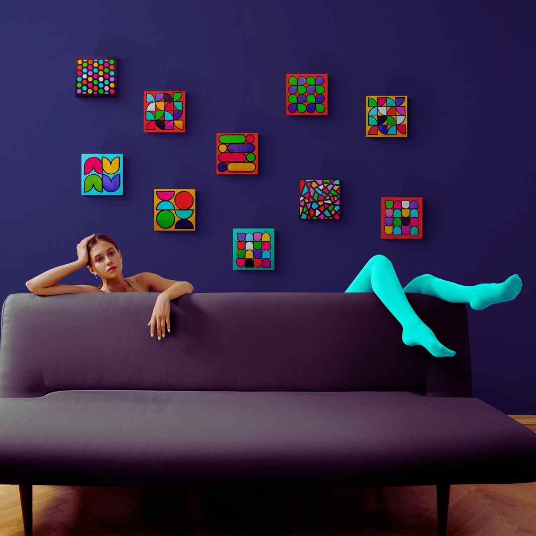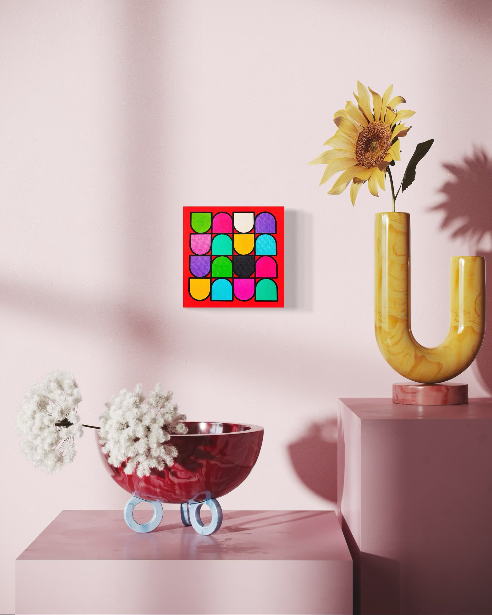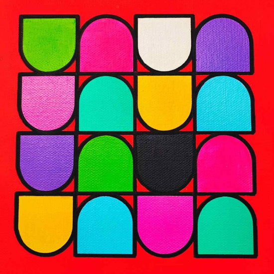 A striking arrangement of capsule-like shapes, this piece captivates with its balanced geometry and a vivid palette of contrasting hues. The vibrant red background intensifies the playful yet structured design, making it ideal for energizing modern interiors.