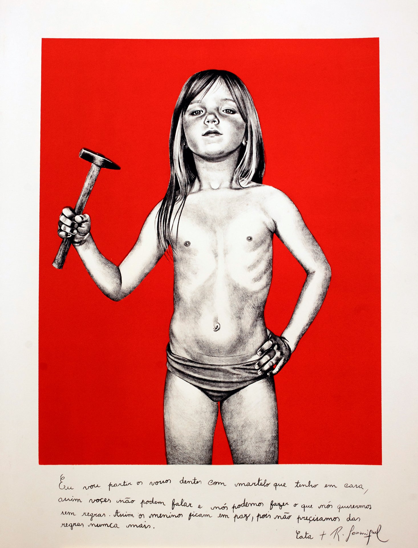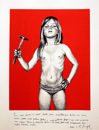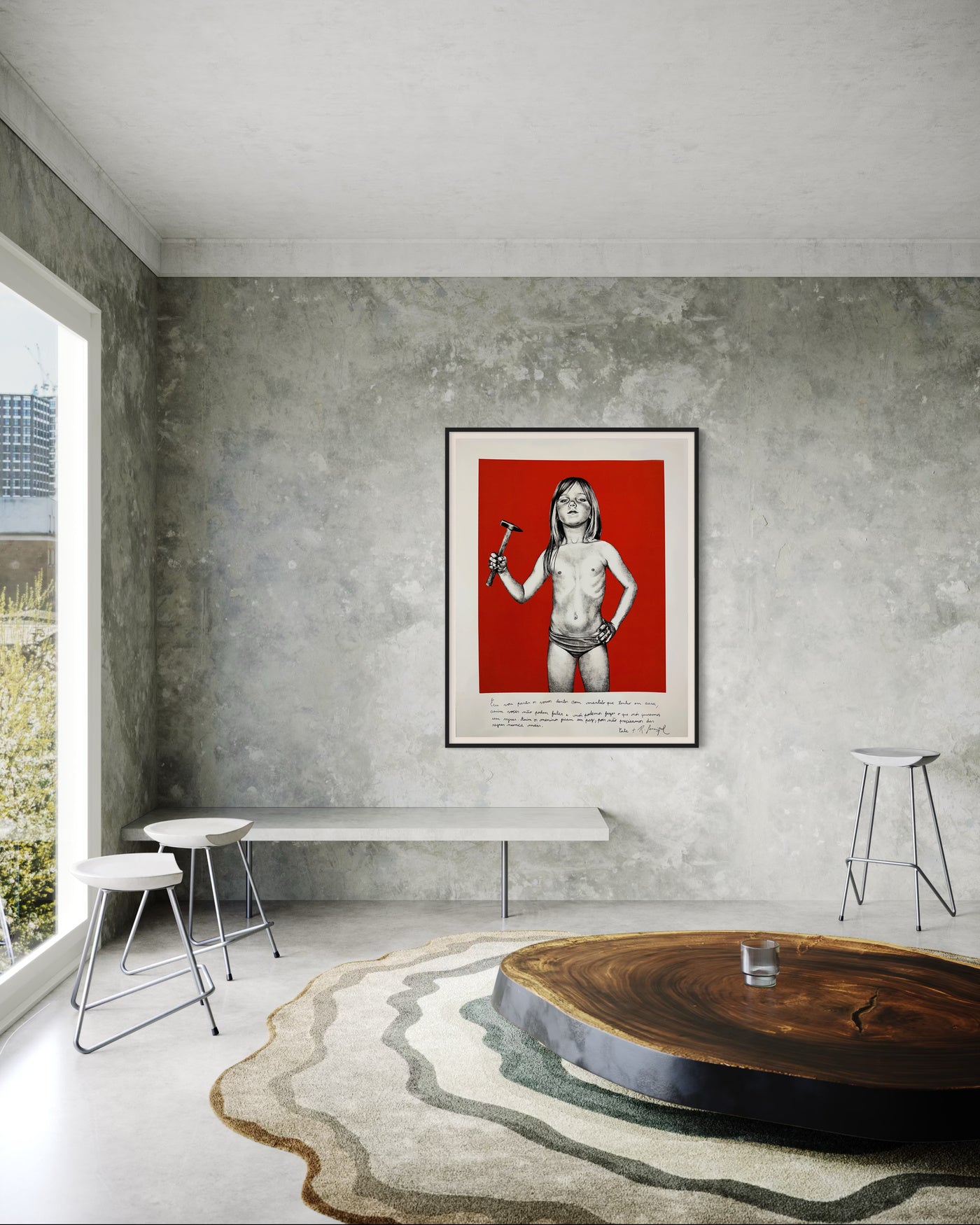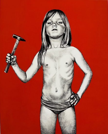 The realistic portrayal of the child, especially with the addition of a hammer, creates a narrative or symbolic depth that is often explored in modern and contemporary art.