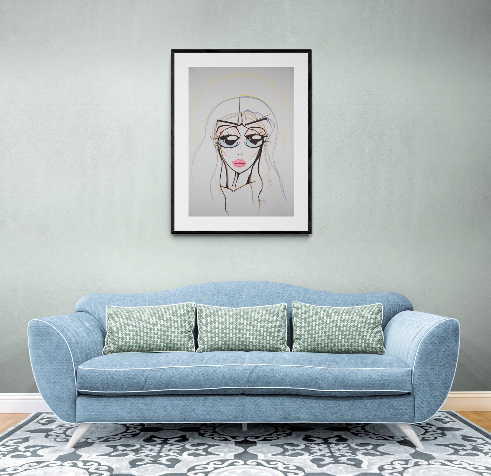 The backdrop is adorned with subtle celestial motifs, suggesting an otherworldly aura.