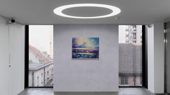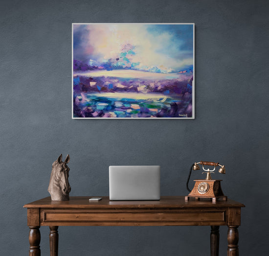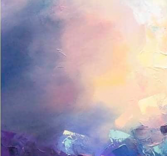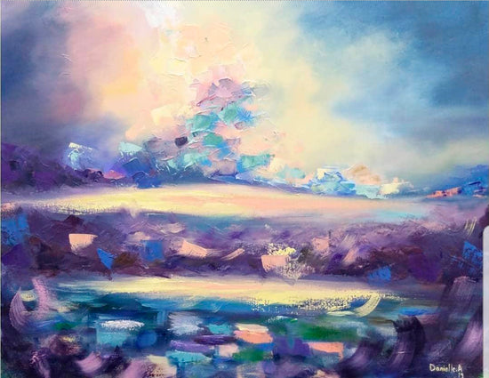 An abstract landscape that captures the meeting of light and color in a dynamic display of texture and emotion. This vibrant composition merges deep purples with soft blues and hints of pink, creating a sense of calm amidst the chaos of nature’s elements.