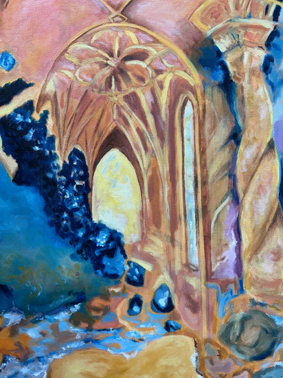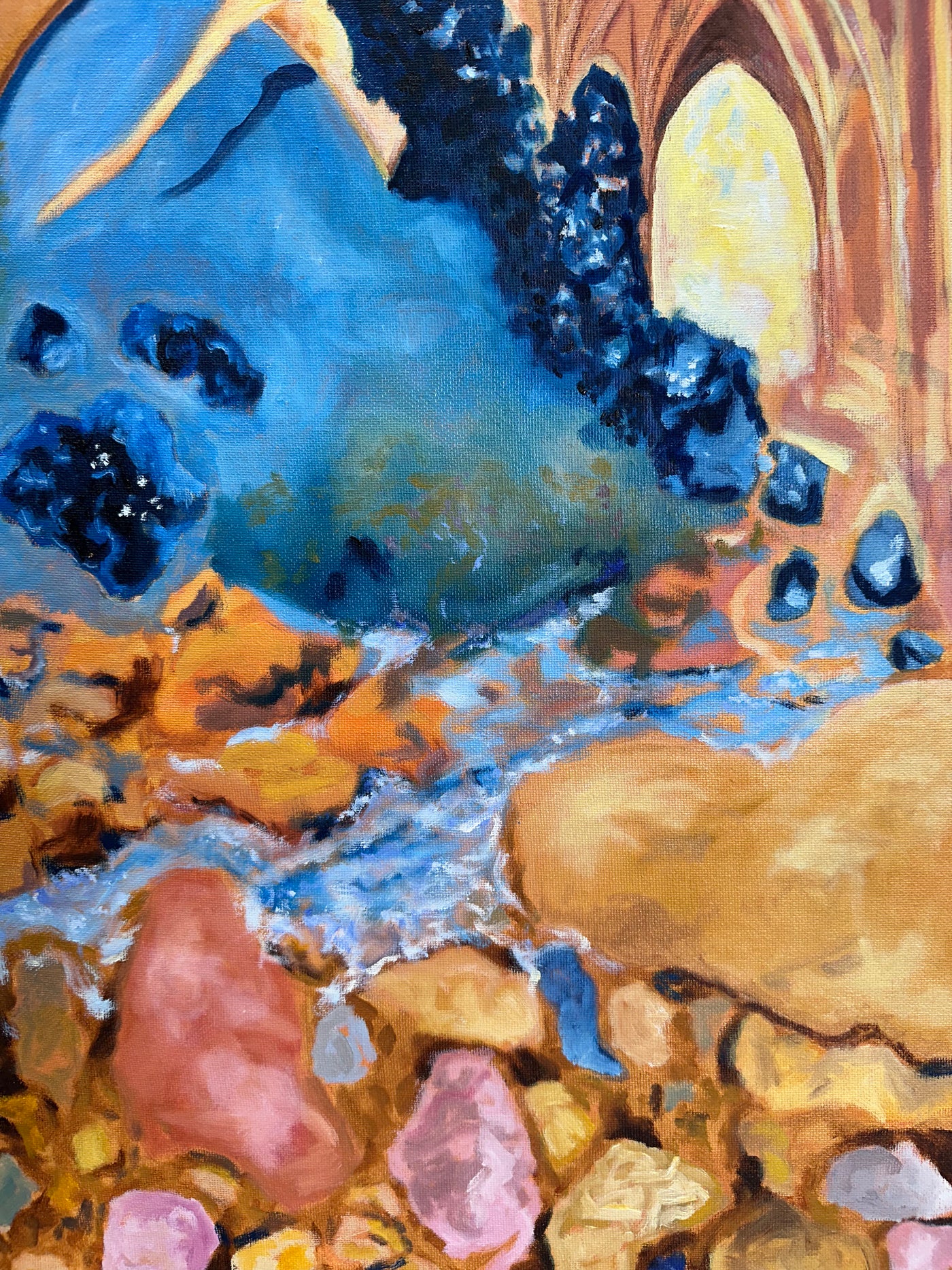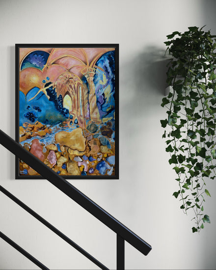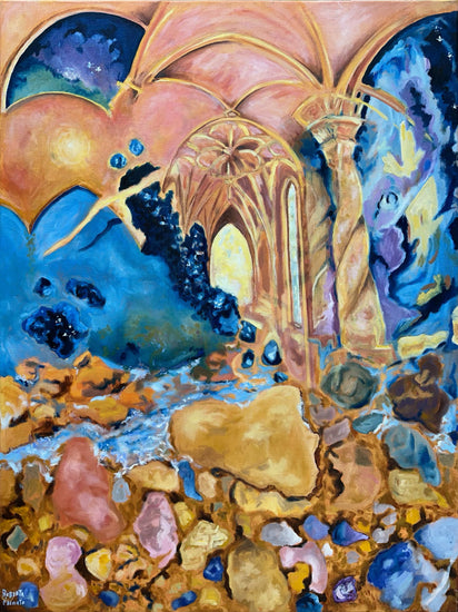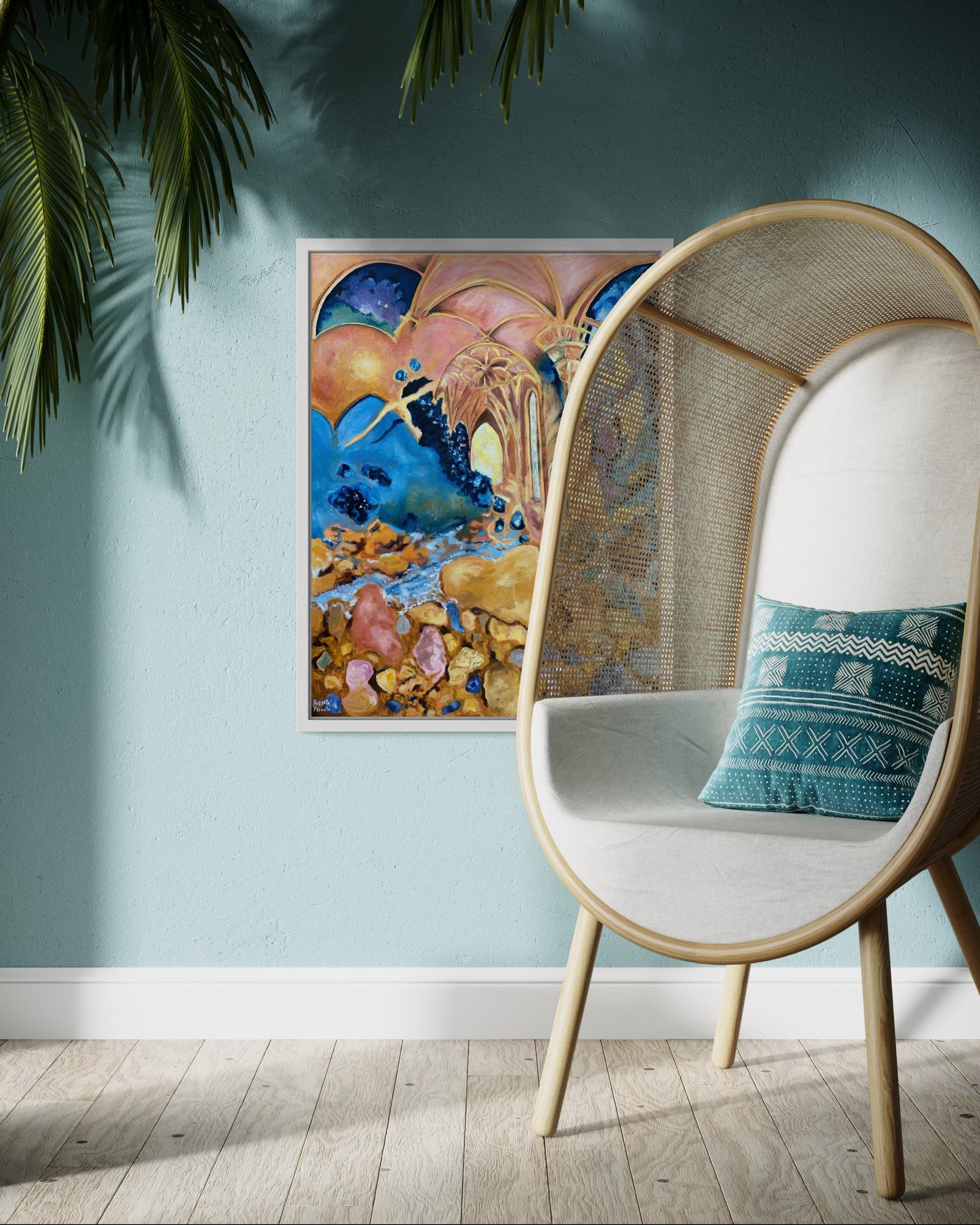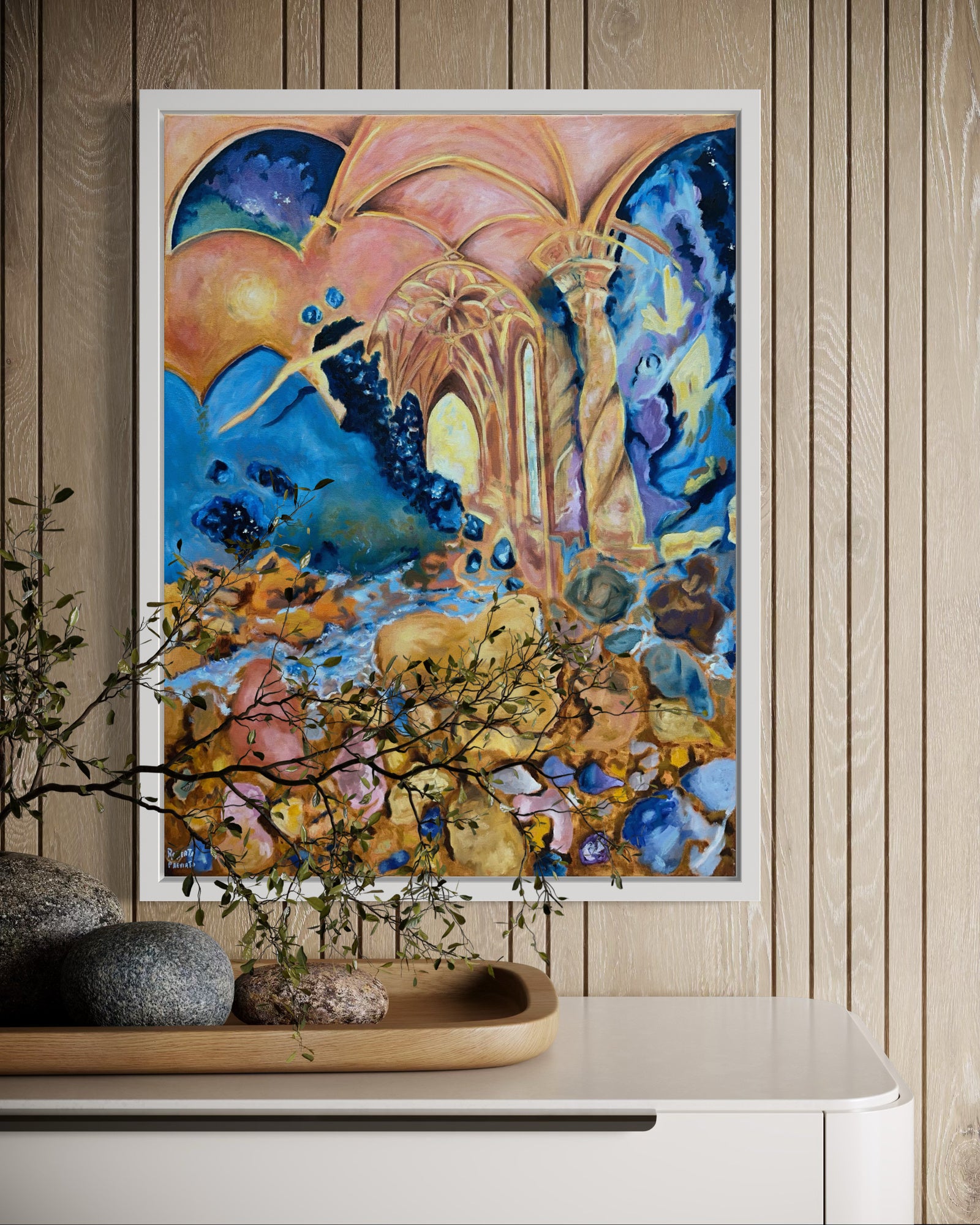 Radiant pinks, golds, and blues evoke both earthly warmth and otherworldly mystery, inviting viewers into a realm of spiritual wonder.