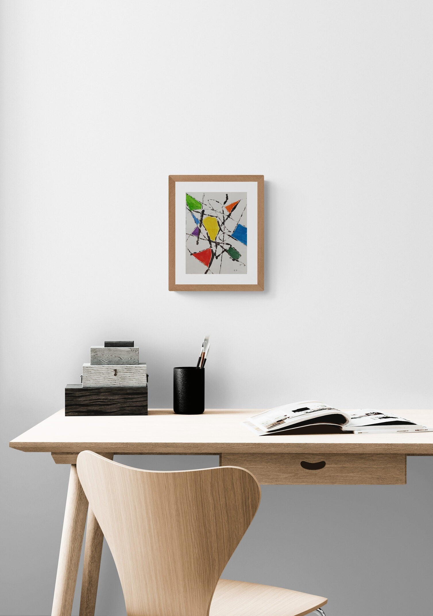 The lively yellow, red, green, orange, blue, and purple forms are seemingly scattered across the canvas, yet the sweeping black lines bring unity to the composition. This artwork explores the juxtaposition between chaos and control, as the bold colors stand out against the stark white background. Ideal for modern spaces, this painting invites the viewer to find order amidst the apparent disorder, making it a thought-provoking addition to any collection.