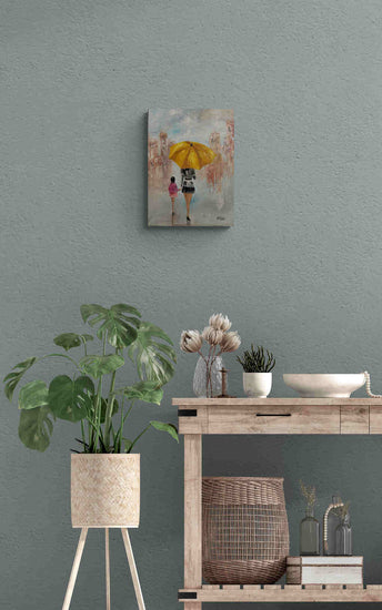 In this emotive composition, a mother and child walk hand-in-hand under a large yellow umbrella, set against a backdrop of a blurred cityscape. The painting's focus on the figures, highlighted by the vivid yellow of the umbrella, draws the viewer's eye to the intimate bond between the two. The technique used here, often associated with impressionism, blends swift brushstrokes with a soft focus, imbuing the scene with a sense of intimacy and immediacy.